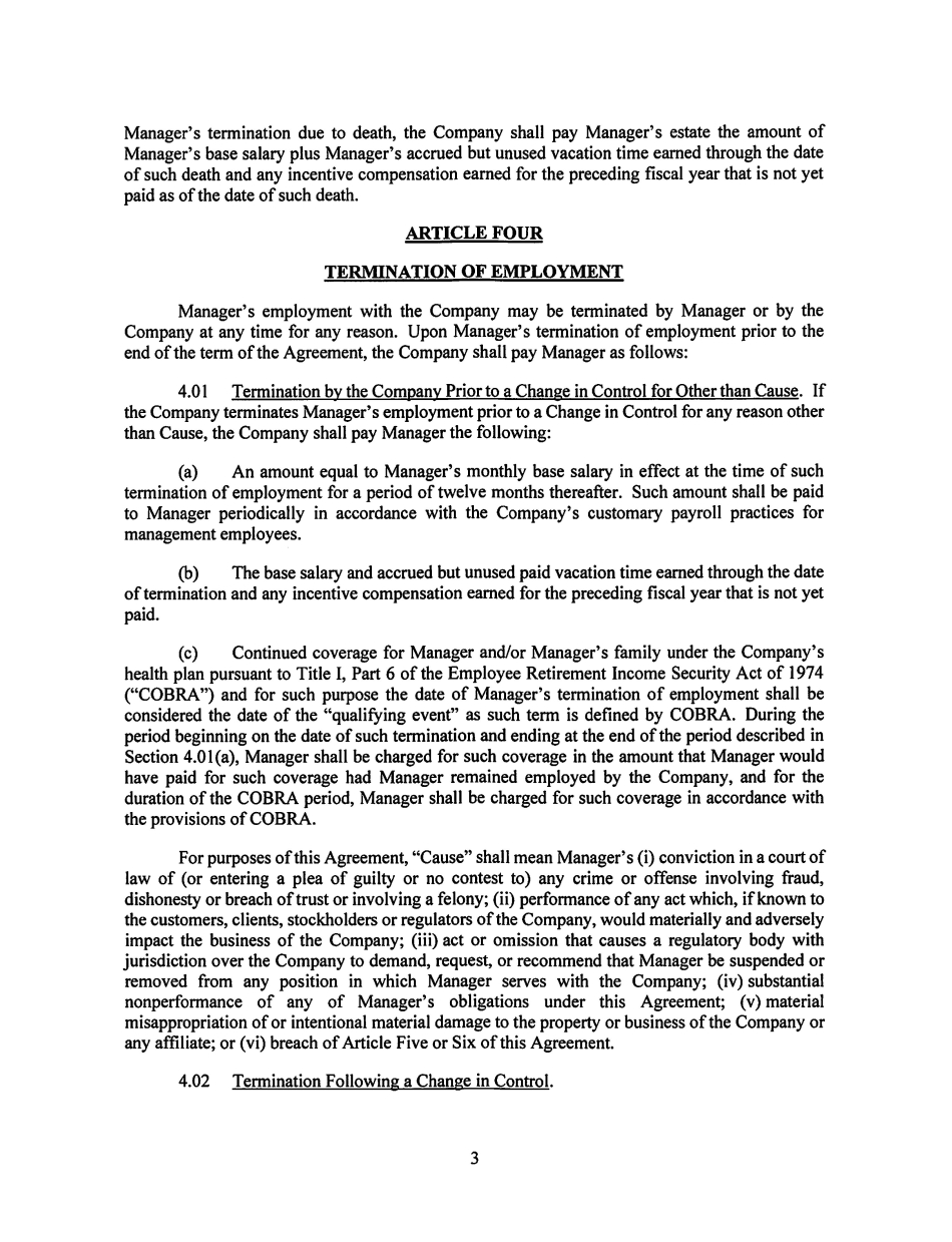 3 Manager's termination due to death, the Company shall pay Manager's estate the amount of Manager's base salary plus Manager's accrued but unused vacation time earned through the date of such death and any incentive compensation earned for the preceding fiscal year that is not yet paid as of the date of such death . ARTICLE FOUR TERMINATION OF EMPLOYMENT Manager's employment with the Company may be terminated by Manager or by the Company at any time for any reason . Upon Manager's termination of employment prior to the end of the term of the Agreement, the Company shall pay Manager as follows : 4 . 01 Termination by the Company Prior to a Change in Control for Other than Cause . If the Company terminates Manager's employment prior to a Change in Control for any reason other than Cause, the Company shall pay Manager the following : (a) An amount equal to Manager's monthly base salary in effect at the time of such termination of employment for a period of twelve months thereafter . Such amount shall be paid to Manager periodically in accordance with the Company's customary payroll practices for management employees . (b) The base salary and accrued but unused paid vacation time earned through the date of termination and any incentive compensation earned for the preceding fiscal year that is not yet paid . (c) Continued coverage for Manager and/or Manager's family under the Company's health plan pursuant to Title I, Part 6 of the Employee Retirement Income Security Act of 1974 ("COBRA") and for such purpose the date of Manager's termination of employment shall be considered the date of the "qualifying event" as such term is defined by COBRA . During the period beginning on the date of such termination and ending at the end of the period described in Section 4 . 0 l(a), Manager shall be charged for such coverage in the amount that Manager would have paid for such coverage had Manager remained employed by the Company, and for the duration of the COBRA period, Manager shall be charged for such coverage in accordance with the provisions of COBRA . For purposes of this Agreement, "Cause" shall mean Manager's (i) conviction in a court of law of (or entering a plea of guilty or no contest to) any crime or offense involving fraud, dishonesty or breach of trust or involving a felony ; {ii) performance of any act which, if known to the customers, clients, stockholders or regulators of the Company, would materially and adversely impact the business of the Company ; (iii) act or omission that causes a regulatory body with jurisdiction over the Company to demand, request, or recommend that Manager be suspended or removed from any position in which Manager serves with the Company ; (iv) substantial nonperformance of any of Manager's obligations under this Agreement ; (v) material misappropriation of or intentional material damage to the property or business of the Company or any affiliate ; or (vi) breach of Article Five or Six of this Agreement . 4.02 Termination Following a Change in Control.