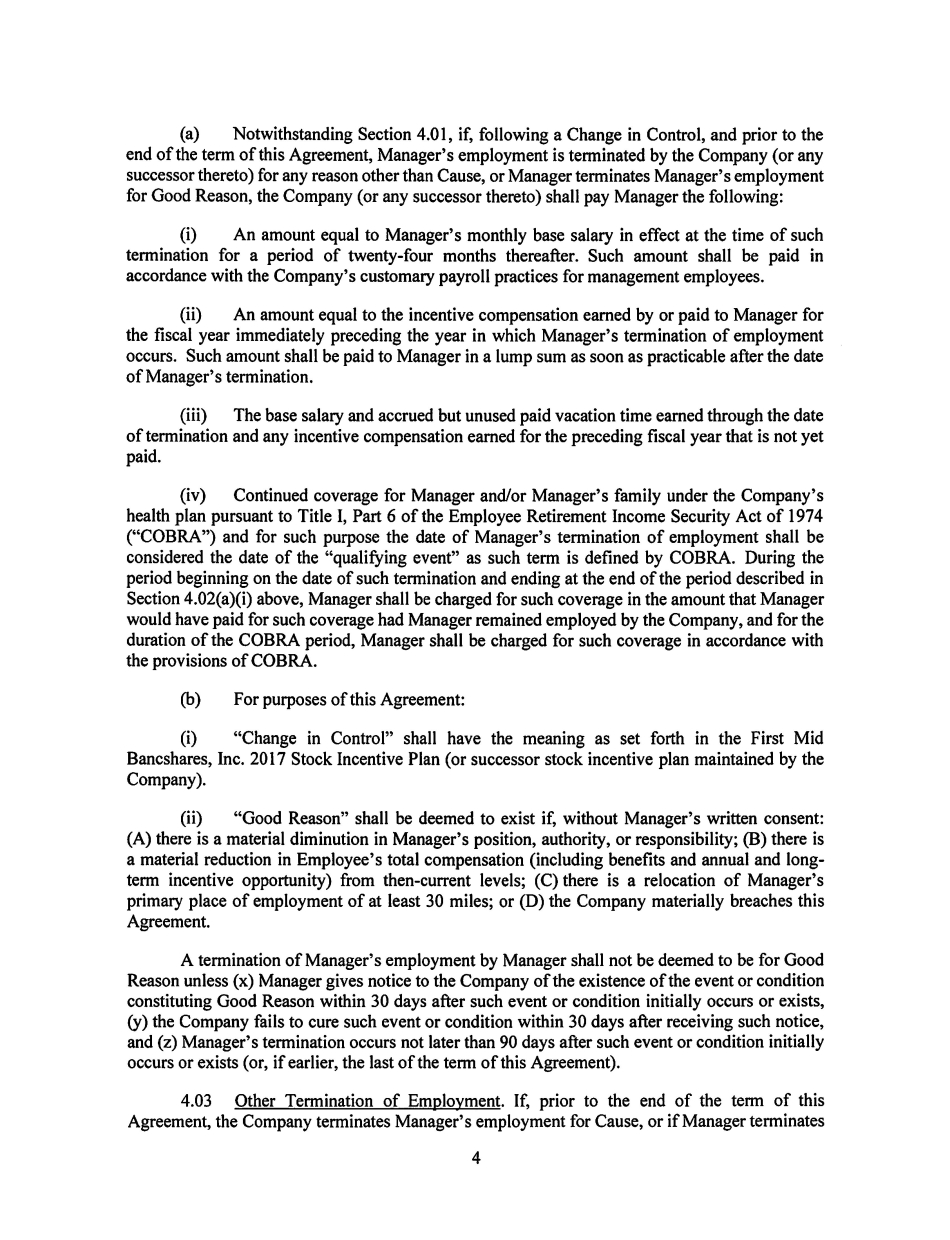 4 (a) Notwithstanding Section 4 . 01 , if, following a Change in Control, and prior to the end of the term of this Agreement, Manager's employment is tenninated by the Company (or any successor thereto) for any reason other than Cause, or Manager terminates Manager's employment for Good Reason, the Company (or any successor thereto) shall pay Manager the following : (i) An amount equal to Manager's monthly base salary in effect at the time of such termination for a period of twenty - four months thereafter . Such amount shall be paid in accordance with the Company's customary payroll practices for management employees . (ii) An amount equal to the incentive compensation earned by or paid to Manager for the fiscal year immediately preceding the year in which Manager's termination of employment occurs . Such amount shall be paid to Manager in a lump sum as soon as practicable after the date of Manager's termination . (iii) The base salary and accrued but unused paid vacation time earned through the date of termination and any incentive compensation earned for the preceding fiscal year that is not yet paid . (iv) Continued coverage for Manager and/or Manager's family under the Company's health plan pursuant to Title I, Part 6 of the Employee Retirement Income Security Act of 1974 ("COBRA") and for such purpose the date of Manager's termination of employment shall be considered the date of the "qualifying event" as such term is defined by COBRA . During the period beginning on the date of such termination and ending at the end of the period described in Section 4 . 02 (a)(i) above, Manager shall be charged for such coverage in the amount that Manager would have paid for such coverage had Manager remained employed by the Company, and for the duration of the COBRA period, Manager shall be charged for such coverage in accordance with the provisions of COBRA . (b) For purposes of this Agreement : (i) "Change in Control" shall have the meaning as set forth in the First Mid Bancshares, Inc . 2017 Stock Incentive Plan (or successor stock incentive plan maintained by the Company) . (ii) "Good Reason" shall be deemed to exist if, without Manager's written consent : (A) there is a material diminution in Manager's position, authority, or responsibility ; (B) there is a material reduction in Employee's total compensation (including benefits and annual and long term incentive opportunity) from then - current levels ; (C) there is a relocation of Manager's primary place of employment of at least 30 miles ; or (D) the Company materially breaches this Agreement . A termination of Manager's employment by Manager shall not be deemed to be for Good Reason unless (x) Manager gives notice to the Company of the existence of the event or condition constituting Good Reason within 30 days after such event or condition initially occurs or exists, (y) the Company fails to cure such event or condition within 30 days after receiving such notice, and (z) Manager's termination occurs not later than 90 days after such event or condition initially occurs or exists (or, if earlier, the last of the term of this Agreement) . 4 . 03 Other Termination of Employment . If, prior to the end of the term of this Agreement, the Company terminates Manager's employment for Cause, or if Manager terminates