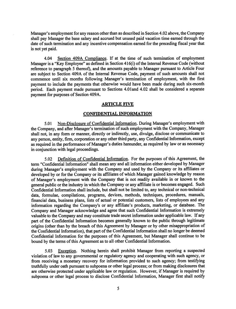 5 Manager's employment for any reason other than as described in Section 4 . 02 above, the Company shall pay Manager the base salary and accrued but unused paid vacation time earned through the date of such termination and any incentive compensation earned for the preceding fiscal year that is not yet paid . 4 . 04 Section 409 A Compliance . If at the time of such termination of employment Manager is a "Key Employee" as defined in Section 416 (i) of the Internal Revenue Code (without reference to paragraph 5 thereof), and the amounts payable to Manager pursuant to Article Four are subject to Section 409 A of the Internal Revenue Code, payment of such amounts shall not commence until six months following Manager's termination of employment, with the first payment to include the payments that otherwise would have been made during such six - month period . Each payment made pursuant to Sections 4 . 01 and 4 . 02 shall be considered a separate payment for purposes of Section 409 A . ARTICLE FIVE CONFIDENTIAL INFORMATION 1. Non - Disclosure of Confidential Information . During Manager's employment with the Company, and after Manager's termination of such employment with the Company, Manager shall not, in any form or manner, directly or indirectly, use, divulge, disclose or communicate to any person, entity, firm, corporation or any other third party, any Confidential Information, except as required in the performance of Manager's duties hereunder, as required by law or as necessary in conjunction with legal proceedings . 2. Definition of Confidential Information . For the purposes of this Agreement, the term "Confidential Information" shall mean any and all information either developed by Manager during Manager's employment with the Company and used by the Company or its affiliates or developed by or for the Company or its affiliates of which Manager gained knowledge by reason of Manager's employment with the Company that is not readily available in or known to the general public or the industry in which the Company or any affiliate is or becomes engaged . Such Confidential Information shall include, but shall not be limited to, any technical or non - technical data, formulae, compilations, programs, devices, methods, techniques, procedures, manuals, financial data, business plans, lists of actual or potential customers, lists of employees and any information regarding the Company's or any affiliate's products, marketing, or database . The Company and Manager acknowledge and agree that such Confidential Information is extremely valuable to the Company and may constitute trade secret information under applicable law . If any part of the Confidential Information becomes generally known to the public through legitimate origins (other than by the breach of this Agreement by Manager or by other misappropriation of the Confidential Information), that part of the Confidential Information shall no longer be deemed Confidential Information for the purposes of this Agreement, but Manager shall continue to be bound by the terms of this Agreement as to all other Confidential Information . 3. Exception . Nothing herein shall prohibit Manager from reporting a suspected violation of law to any governmental or regulatory agency and cooperating with such agency, or from receiving a monetary recovery for information provided to such agency ; from testifying truthfully under oath pursuant to subpoena or other legal process ; or from making disclosures that are otherwise protected under applicable law or regulation . However, if Manager is required by subpoena or other legal process to disclose Confidential Information, Manager first shall notify