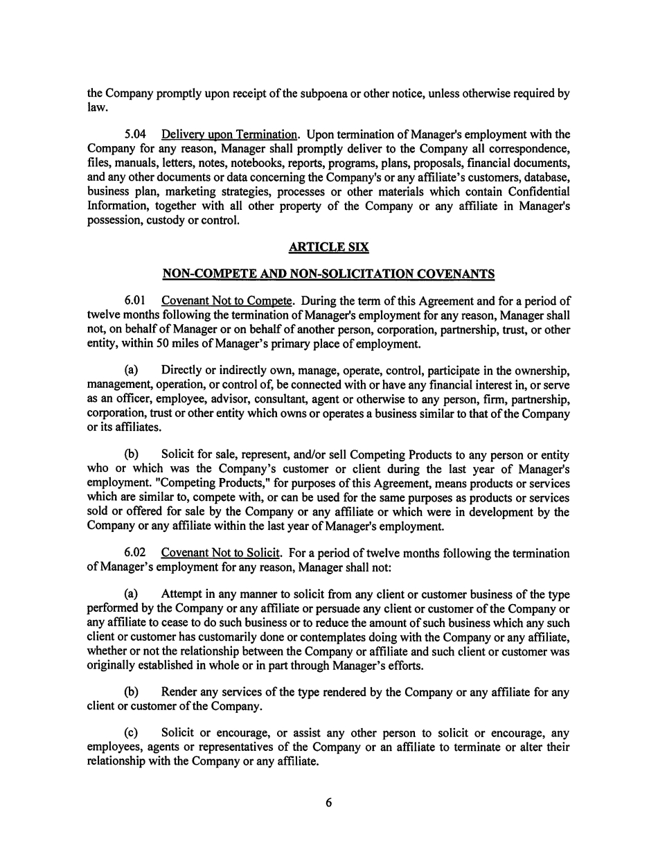 6 the Company promptly upon receipt of the subpoena or other notice, unless otherwise required by law. 5 . 04 Delivery upon Termination . Upon termination of Manager's employment with the Company for any reason, Manager shall promptly deliver to the Company all correspondence, files, manuals, letters, notes, notebooks, reports, programs, plans, proposals, financial documents, and any other documents or data concerning the Company's or any affiliate's customers, database, business plan, marketing strategies, processes or other materials which contain Confidential Information, together with all other property of the Company or any affiliate in Manager's possession, custody or control . ARTICLE SIX NON - COMPETE AND NON - SOLICITATION COVENANTS 6 . 01 Covenant Not to Compete . During the term of this Agreement and for a period of twelve months following the termination of Manager's employment for any reason, Manager shall not, on behalf of Manager or on behalf of another person, corporation, partnership, trust, or other entity, within 50 miles of Manager's primary place of employment . (a) Directly or indirectly own, manage, operate, control, participate in the ownership, management, operation, or control of, be connected with or have any financial interest in, or serve as an officer, employee, advisor, consultant, agent or otherwise to any person, firm, partnership, corporation, trust or other entity which owns or operates a business similar to that of the Company or its affiliates . (b) Solicit for sale, represent, and/or sell Competing Products to any person or entity who or which was the Company's customer or client during the last year of Manager's employment . "Competing Products," for purposes of this Agreement, means products or services which are similar to, compete with, or can be used for the same purposes as products or services sold or offered for sale by the Company or any affiliate or which were in development by the Company or any affiliate within the last year of Manager's employment . 6 . 02 Covenant Not to Solicit . For a period of twelve months following the termination of Manager's employment for any reason, Manager shall not : (a) Attempt in any manner to solicit from any client or customer business of the type performed by the Company or any affiliate or persuade any client or customer of the Company or any affiliate to cease to do such business or to reduce the amount of such business which any such client or customer has customarily done or contemplates doing with the Company or any affiliate, whether or not the relationship between the Company or affiliate and such client or customer was originally established in whole or in part through Manager's efforts . (b) Render any services of the type rendered by the Company or any affiliate for any client or customer of the Company . (c) Solicit or encourage, or assist any other person to solicit or encourage, any employees, agents or representatives of the Company or an affiliate to terminate or alter their relationship with the Company or any affiliate .