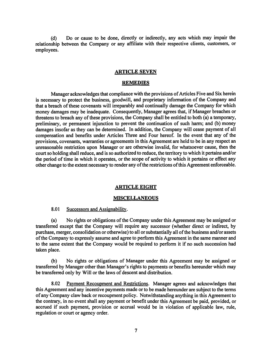 7 (d) Do or cause to be done, directly or indirectly, any acts which may impair the relationship between the Company or any affiliate with their respective clients, customers, or employees . ARTICLE SEVEN RE:MEDIES Manager acknowledges that compliance with the provisions of Articles Five and Six herein is necessary to protect the business, goodwill, and proprietary information of the Company and that a breach of these covenants will irreparably and continually damage the Company for which money damages may be inadequate . Consequently, Manager agrees that, if Manager breaches or threatens to breach any of these provisions, the Company shall be entitled to both (a) a temporary, preliminary, or permanent injunction to prevent the continuation of such harm ; and (b) money damages insofar as they can be determined . In addition, the Company will cease payment of all compensation and benefits under Articles Three and Four hereof . In the event that any of the provisions, covenants, warranties or agreements in this Agreement are held to be in any respect an unreasonable restriction upon Manager or are otherwise invalid, for whatsoever cause, then the court so holding shall reduce, and is so authorized to reduce, the territory to which it pertains and/or the period of time in which it operates, or the scope of activity to which it pertains or effect any other change to the extent necessary to render any of the restrictions of this Agreement enforceable . ARTICLE EIGHT MISCELLANEOUS 8.01 Successors and Assignability. (a) No rights or obligations of the Company under this Agreement may be assigned or transferred except that the Company will require any successor (whether direct or indirect, by purchase, merger, consolidation or otherwise) to all or substantially all of the business and/or assets of the Company to expressly assume and agree to perform this Agreement in the same manner and to the same extent that the Company would be required to perform it if no such succession had taken place . (b) No rights or obligations of Manager under this Agreement may be assigned or transferred by Manager other than Manager's rights to payments or benefits hereunder which may be transferred only by Will or the laws of descent and distribution . 8 . 02 Payment Recoupment and Restrictions . Manager agrees and acknowledges that this Agreement and any incentive payments made or to be made hereunder are subject to the terms of any Company claw back or recoupment policy . Notwithstanding anything in this Agreement to the contrary, in no event shall any payment or benefit under this Agreement be paid, provided, or accrued if such payment, provision or accrual would be in violation of applicable law, rule, regulation or court or agency order .