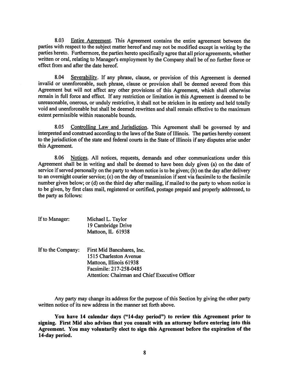 8 3. Entire Agreement . This Agreement contains the entire agreement between the parties with respect to the subject matter hereof and may not be modified except in writing by the parties hereto . Furthermore, the parties hereto specifically agree that all prior agreements, whether written or oral, relating to Manager's employment by the Company shall be of no further force or effect from and after the date hereof . 4. Severability . If any phrase, clause, or provision of this Agreement is deemed invalid or unenforceable, such phrase, clause or provision shall be deemed severed from this Agreement but will not affect any other provisions of this Agreement, which shall otherwise remain in full force and effect . If any restriction or limitation in this Agreement is deemed to be unreasonable, onerous, or unduly restrictive, it shall not be stricken in its entirety and held totally void and unenforceable but shall be deemed rewritten and shall remain effective to the maximum extent permissible within reasonable bounds . 5. Controlling Law and Jurisdiction . This Agreement shall be governed by and interpreted and construed according to the laws of the State of Illinois . The parties hereby consent to the jurisdiction of the state and federal courts in the State of Illinois if any disputes arise under this Agreement . 6. Notices . All notices, requests, demands and other communications under this Agreement shall be in writing and shall be deemed to have been duly given (a) on the date of service if served personally on the party to whom notice is to be given ; (b) on the day after delivery to an overnight courier service ; (c) on the day of transmission if sent via facsimile to the facsimile number given below ; or (d) on the third day after mailing, if mailed to the party to whom notice is to be given, by first class mail, registered or certified, postage prepaid and properly addressed, to the party as follows : If to Manager: Michael L. Taylor 19 Cambridge Drive Mattoon,IL 61938 Ifto the Company: First Mid Bancshares, Inc. 1515 Charleston Avenue Mattoon, Illinois 61938 Facsimile: 217 - 258 - 0485 Attention: Chairman and Chief Executive Officer Any party may change its address for the purpose of this Section by giving the other party written notice of its new address in the manner set forth above . You have 14 calendar days (" 14 - day period") to review this Agreement prior to signing . First Mid also advises that you consult with an attorney before entering into this Agreement . You may voluntarily elect to sign this Agreement before the expiration of the 14 - day period .