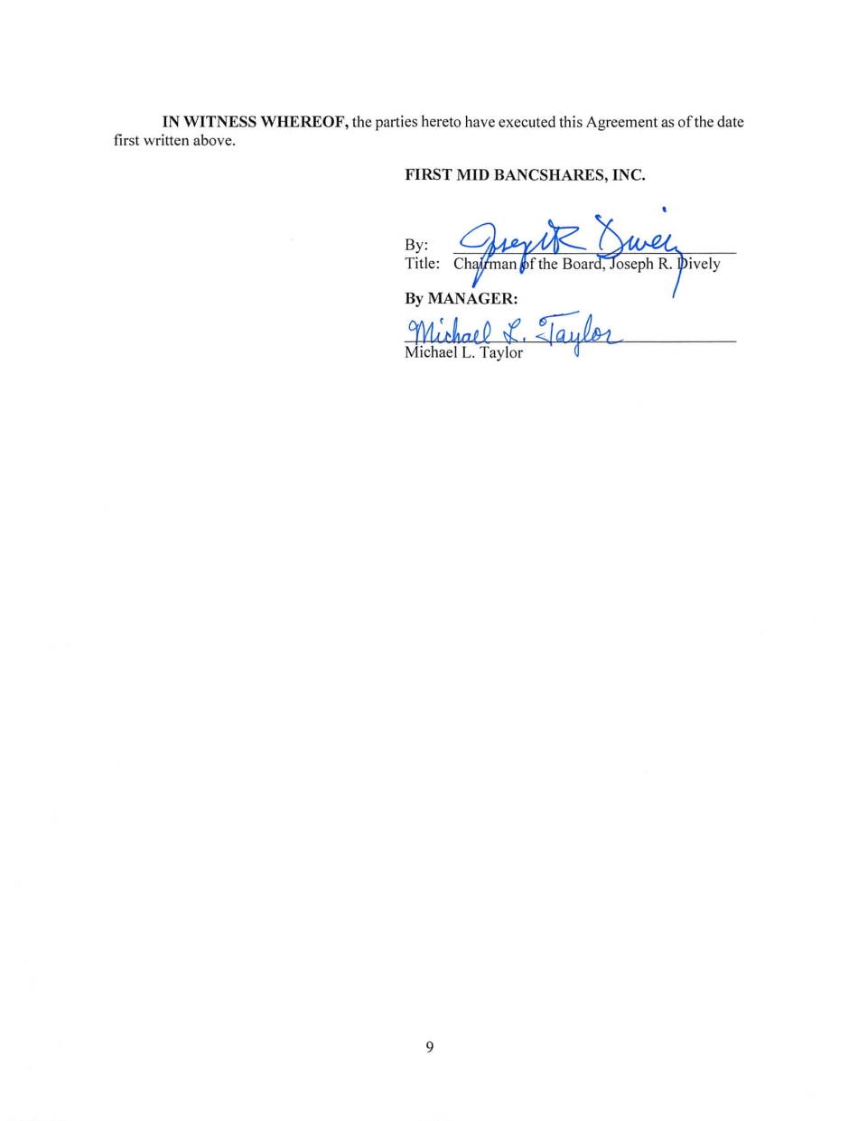 IN WITNESS WHEREOF, the parties hereto have executed this Agreement as of the date first written above. FIRST MID BANCSHARES, INC. 9 By: T itl e: By MANAGER: "fl'u'JnlQ ,t , Michael L. Taylor
