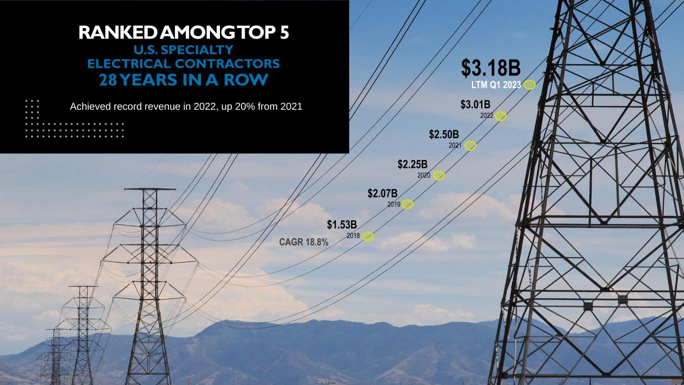 4 Achieved record revenue in 2022, up 20% from 2021 $3.18B LTM Q1 2023 $1.53B 2018 $2.07B 2019 $2.25B 2020 $3.01B 2022 RANKED AMONG TOP 5 U.S. SPECIALTY ELECTRICAL CONTRACTORS 28 YEARS IN A ROW $2.50B 2021 CAGR 18.8%
