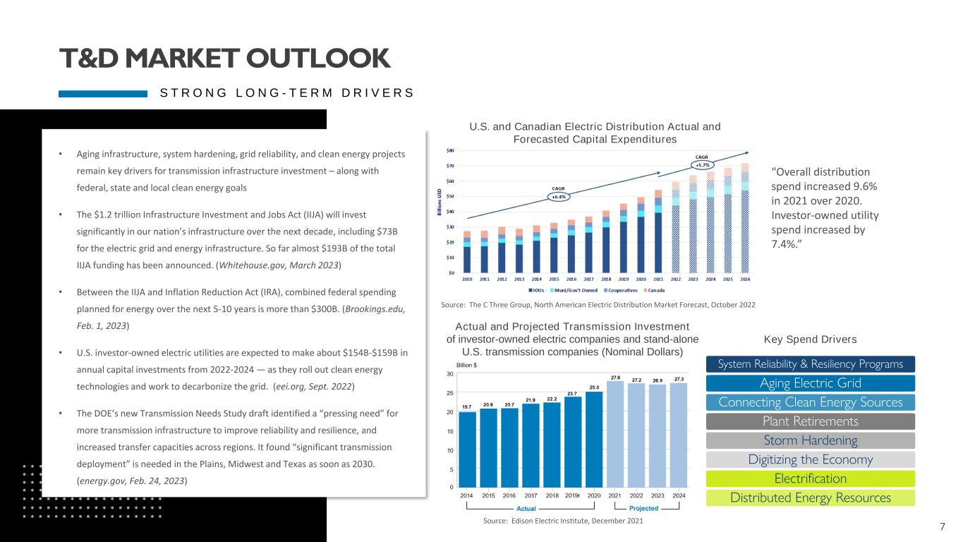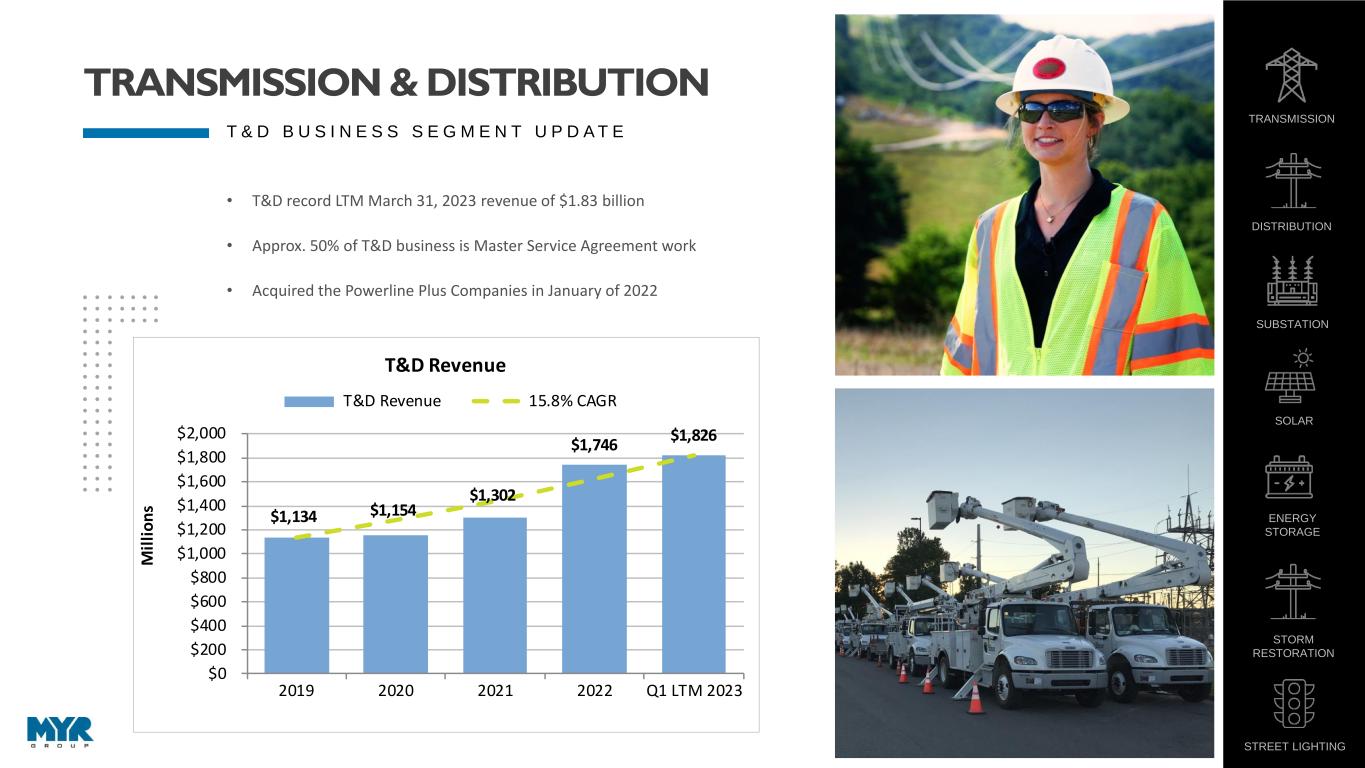 6 T & D B U S I N E S S S E G M E N T U P D A T E • T&D record LTM March 31, 2023 revenue of $1.83 billion • Approx. 50% of T&D business is Master Service Agreement work • Acquired the Powerline Plus Companies in January of 2022 $1,134 $1,154 $1,302 $1,746 $1,826 $0 $200 $400 $600 $800 $1,000 $1,200 $1,400 $1,600 $1,800 $2,000 2019 2020 2021 2022 Q1 LTM 2023 M il li o n s T&D Revenue T&D Revenue 15.8% CAGR TRANSMISSION & DISTRIBUTION TRANSMISSION DISTRIBUTION SUBSTATION SOLAR ENERGY STORAGE STORM RESTORATION STREET LIGHTING