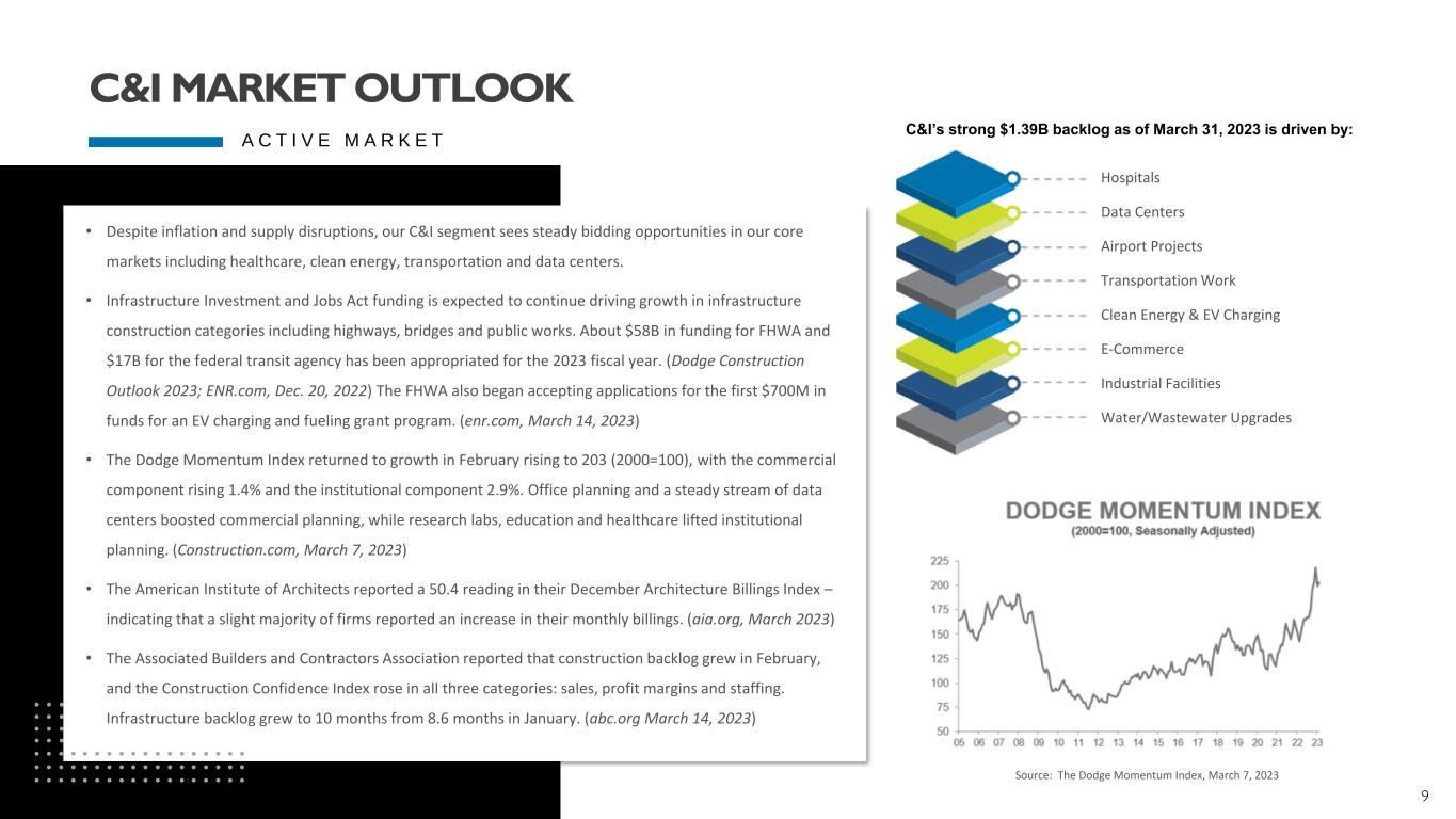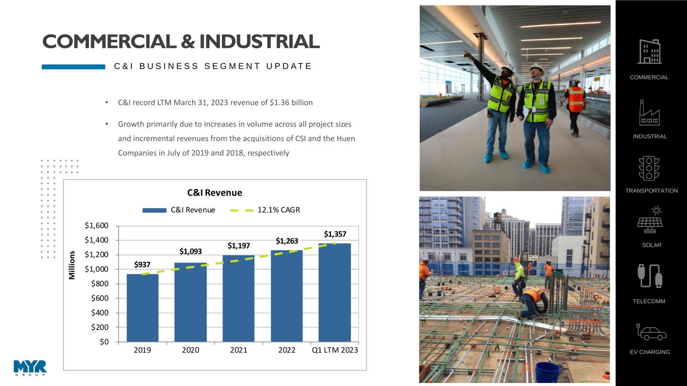 8 • C&I record LTM March 31, 2023 revenue of $1.36 billion • Growth primarily due to increases in volume across all project sizes and incremental revenues from the acquisitions of CSI and the Huen Companies in July of 2019 and 2018, respectively $937 $1,093 $1,197 $1,263 $1,357 $0 $200 $400 $600 $800 $1,000 $1,200 $1,400 $1,600 2019 2020 2021 2022 Q1 LTM 2023 M il li o n s C&I Revenue C&I Revenue 12.1% CAGR COMMERCIAL INDUSTRIAL TRANSPORTATION SOLAR TELECOMM EV CHARGING C & I B U S I N E S S S E G M E N T U P D A T E COMMERCIAL & INDUSTRIAL