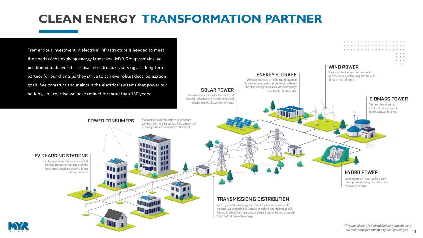 10 UTILITY-SCALE SOLAR Federal Tax Credits Renewable Portfolio Standards Carbon Policy State Tax Incentives Clean Power Portfolios CLEAN ENERGY DRIVERS SOURCE: SEIA/Wood Mackenzie Power & Renewables U.S. Solar Market Insight Report, March 2023 • The generation mix across the U.S. is changing as traditional baseload generation resources retire and clean energy provides an increasingly large percentage of demand. • The Inflation Reduction Act (IRA) is expected to drive annual clean energy investment up to $114 billion by 2031 due to production tax credits for solar, wind, battery storage and low-carbon hydrogen (Woodmac.com Jan. 19, 2023; Utility Dive/Energy Information Administration (eia), Jan. 13, 2023). • Energy storage will also get a boost from IRA tax credits. Utility-scale battery storage capacity is expected to nearly quadruple in the next three years (Utility Dive/eia, Jan. 13, 2023). • The Federal Highway Administration expects to disperse $885M in funding to states for the National Electric Vehicle Infrastructure program in 2023 (fhwa.dot.gov, Sept. 2022). • Renewables surpassed coal as a percentage of electric generation for the first time ever in 2022 and are expected to continue growing. The EIA’s latest Short-Term Energy Outlook forecast that solar, wind and battery storage will account for most added capacity in 2023 and 2024. (wsj.com, eia.gov, March 2023) • More than half of planned utility-scale electric generating capacity additions in 2023 are solar. The EIA said developers planned to add 29.1 GW of utility-scale solar generation this year. Other planned additions include 9.4GW of battery storage and 6GW of wind. (eia.gov, Feb. 6, 2023) Despite the complex procurement environment, Wood Mackenzie forecasts that 139 GWdc of total utility-scale installations will be added between 2023 and 2027, and 429 GWdc will be added over the next decade. With lower installation rates due to supply chain constraints, trade policy issues, and shipment delays, the year-end outlook reported 11.8GWdc of new utility PV solar were installed in 2022 (seia.org, March 9, 2023). G R O W I N G C L E A N E N E R G Y G E N E R A T I O N M I X C R E A T E S O P P O R T U N I T I E S F O R B O T H B U S I N E S S S E G M E N T S MARKET OPPORTUNITIES Utility Solar Installations and Base Case Forecast, 2020-2033