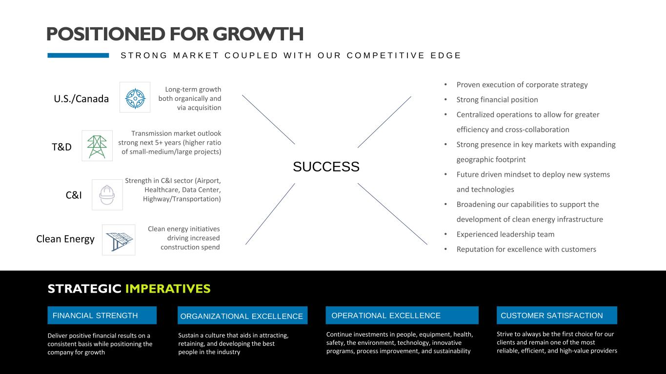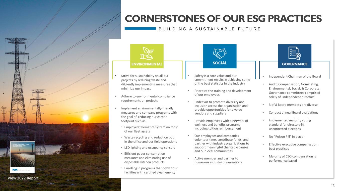 12 U.S./Canada Long-term growth both organically and via acquisition T&D Transmission market outlook strong next 5+ years (higher ratio of small-medium/large projects) C&I Strength in C&I sector (Airport, Healthcare, Data Center, Highway/Transportation) Clean Energy Clean energy initiatives driving increased construction spend SUCCESS STRATEGIC IMPERATIVES FINANCIAL STRENGTH Deliver positive financial results on a consistent basis while positioning the company for growth ORGANIZATIONAL EXCELLENCE Sustain a culture that aids in attracting, retaining, and developing the best people in the industry OPERATIONAL EXCELLENCE Continue investments in people, equipment, health, safety, the environment, technology, innovative programs, process improvement, and sustainability CUSTOMER SATISFACTION Strive to always be the first choice for our clients and remain one of the most reliable, efficient, and high-value providers • Proven execution of corporate strategy • Strong financial position • Centralized operations to allow for greater efficiency and cross-collaboration • Strong presence in key markets with expanding geographic footprint • Future driven mindset to deploy new systems and technologies • Broadening our capabilities to support the development of clean energy infrastructure • Experienced leadership team • Reputation for excellence with customers S T R O N G M A R K E T C O U P L E D W I T H O U R C O M P E T I T I V E E D G E POSITIONED FOR GROWTH