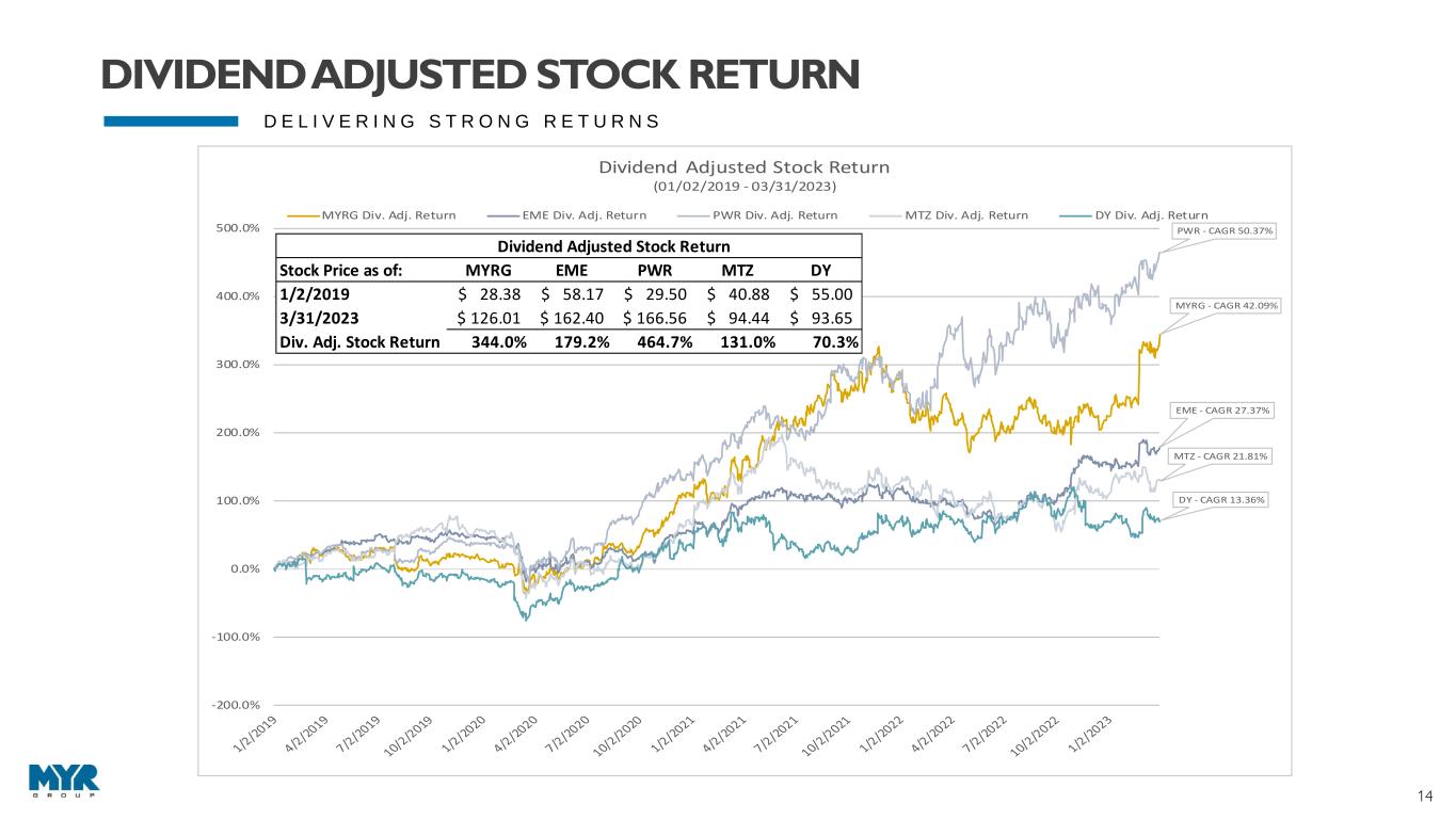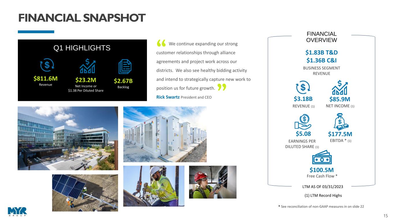 14 D E L I V E R I N G S T R O N G R E T U R N S MYRG - CAGR 42.09% EME - CAGR 27.37% PWR - CAGR 50.37% MTZ - CAGR 21.81% DY - CAGR 13.36% -200.0% -100.0% 0.0% 100.0% 200.0% 300.0% 400.0% 500.0% Dividend Adjusted Stock Return (01/02/2019 - 03/31/2023) MYRG Div. Adj. Return EME Div. Adj. Return PWR Div. Adj. Return MTZ Div. Adj. Return DY Div. Adj. Return Dividend Adjusted Stock Return Stock Price as of: MYRG EME PWR MTZ DY 1/2/2019 28.38$ 58.17$ 29.50$ 40.88$ 55.00$ 3/31/2023 126.01$ 162.40$ 166.56$ 94.44$ 93.65$ Div. Adj. Stock Return 344.0% 179.2% 464.7% 131.0% 70.3% DIVIDEND ADJUSTED STOCK RETURN