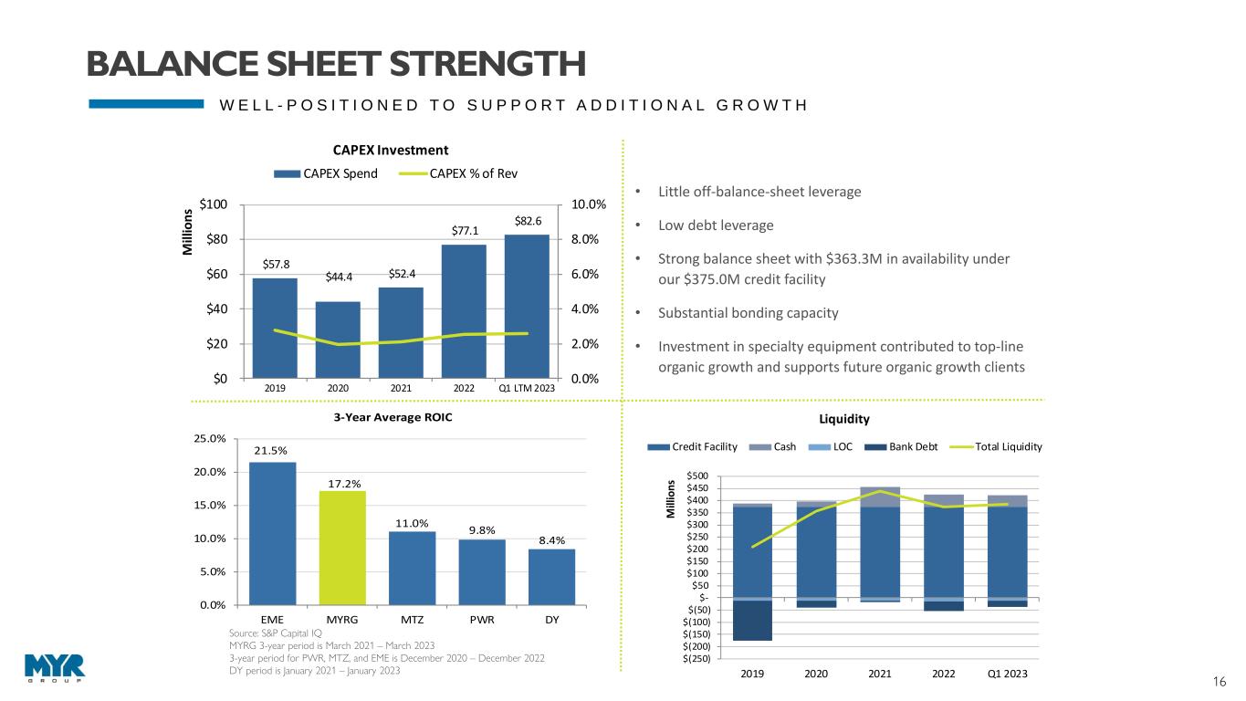 15 * See reconciliation of non-GAAP measures in on slide 22 FINANCIAL SNAPSHOT Q1 HIGHLIGHTS $23.2M Net Income or $1.38 Per Diluted Share $2.67B Backlog $811.6M Revenue BUSINESS SEGMENT REVENUE $1.83B T&D $1.36B C&I REVENUE (1) $3.18B EBITDA * (1) $177.5M EARNINGS PER DILUTED SHARE (1) $5.08 NET INCOME (1) $85.9M FINANCIAL OVERVIEW LTM AS OF 03/31/2023 (1) LTM Record Highs We continue expanding our strong customer relationships through alliance agreements and project work across our districts. We also see healthy bidding activity and intend to strategically capture new work to position us for future growth. Rick Swartz President and CEO “ ” $100.5M Free Cash Flow *