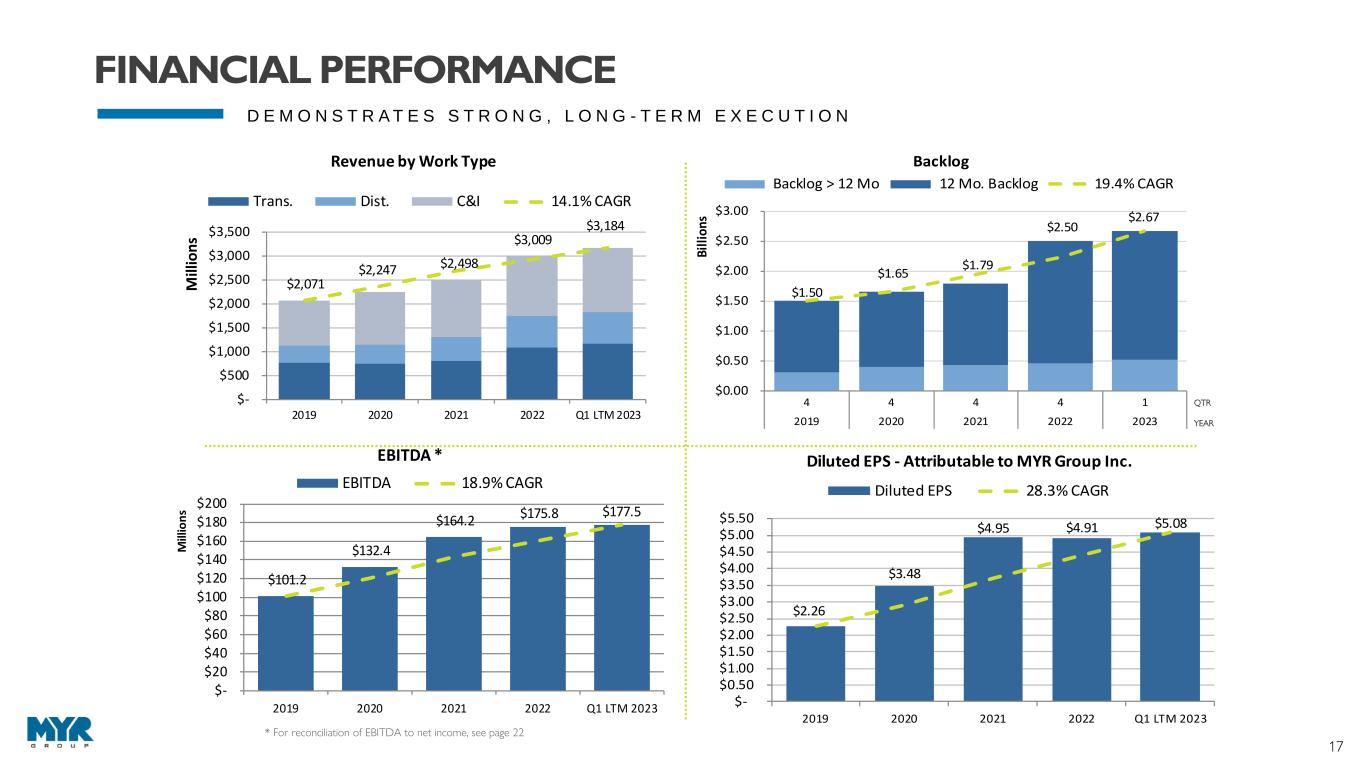 16 W E L L - P O S I T I O N E D T O S U P P O R T A D D I T I O N A L G R O W T H $57.8 $44.4 $52.4 $77.1 $82.6 0.0% 2.0% 4.0% 6.0% 8.0% 10.0% $0 $20 $40 $60 $80 $100 2019 2020 2021 2022 Q1 LTM 2023 M ill io n s CAPEX Investment CAPEX Spend CAPEX % of Rev 21.5% 17.2% 11.0% 9.8% 8.4% 0.0% 5.0% 10.0% 15.0% 20.0% 25.0% EME MYRG MTZ PWR DY 3-Year Average ROIC $(250) $(200) $(150) $(100) $(50) $- $50 $100 $150 $200 $250 $300 $350 $400 $450 $500 2019 2020 2021 2022 Q1 2023 M ill io n s Liquidity Credit Facility Cash LOC Bank Debt Total Liquidity Source: S&P Capital IQ MYRG 3-year period is March 2021 – March 2023 3-year period for PWR, MTZ, and EME is December 2020 – December 2022 DY period is January 2021 – January 2023 • Little off-balance-sheet leverage • Low debt leverage • Strong balance sheet with $363.3M in availability under our $375.0M credit facility • Substantial bonding capacity • Investment in specialty equipment contributed to top-line organic growth and supports future organic growth clients BALANCE SHEET STRENGTH