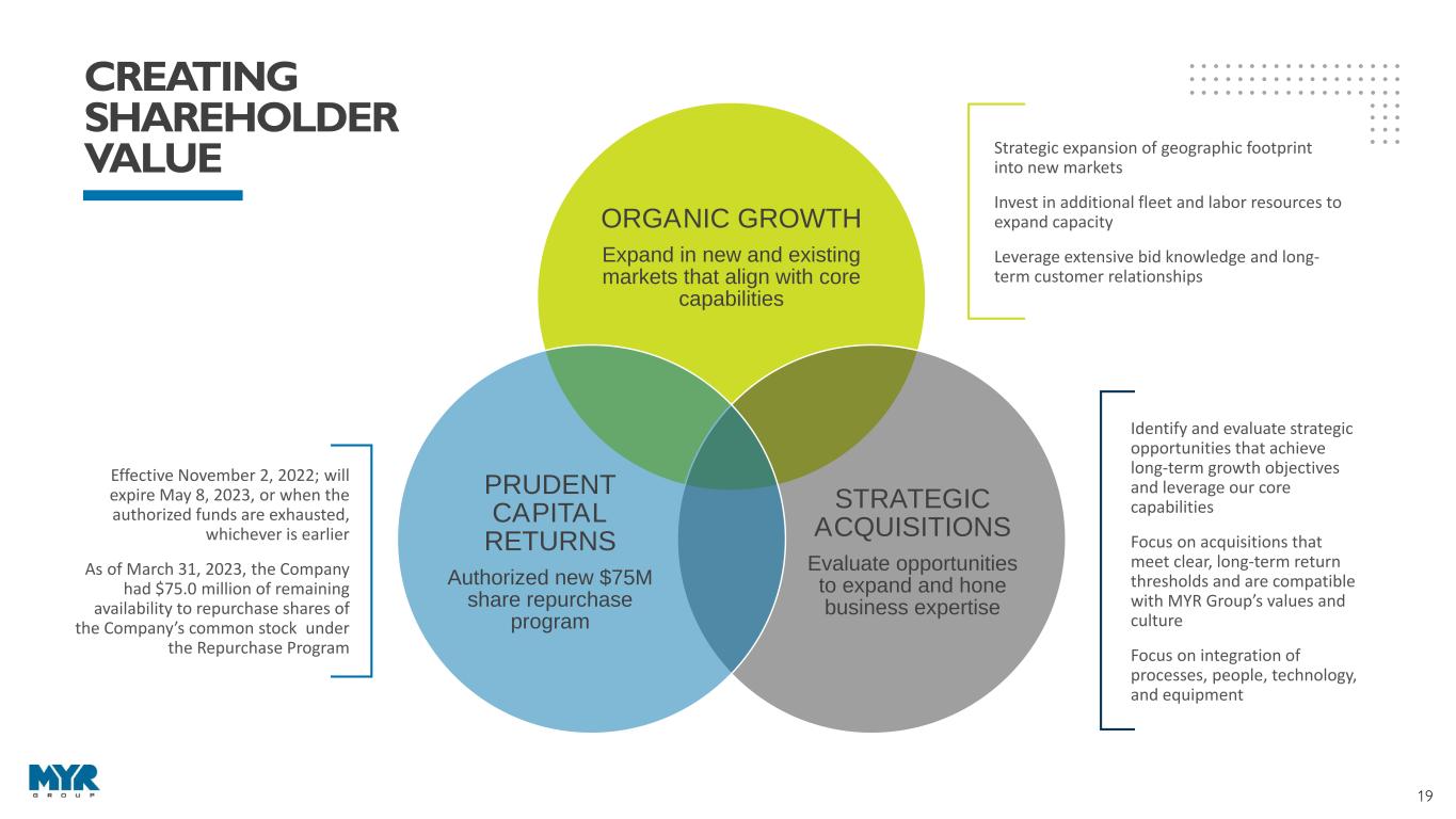18 EXECUTIVE LEADERSHIP Rick Swartz, CEO MYRG: 40 years Industry: 40 years 21 YEARS EXECUTIVES AVERAGE WITH MYR GROUP Effective February 24, 2023 EXPERIENCED LEADERSHIP E X E C U T I V E S & B O A R D O F D I R E C T O R S MYR Group Inc. has a strong team of experienced leaders that make up our executive team and Board of Directors. We believe diversity of our leadership is a critical component of creating long-term value for our shareholders. We select individuals that bring extensive experience and unique perspectives to both our Company and our Board. Kelly Huntington, CFO MYRG: >1 years Industry: 20 years Tod Cooper, COO - T&D MYRG: 32 years Industry: 34 years Don Egan, COO - C&I* MYRG: 31 years Industry: 31 years *Effective May 1, 2023 William Fry, CLO MYRG: 4 years Industry: 25 years 30 YEARS INDUSTRY EXPERIENCE 25% Female 88% Majority Independent 38% Diverse Directors BOARD OF DIRECTORS STATISTICS 7:1 Varied Tenure 7 of 8 have 0- 7 years 1 of 8 have 11+ years