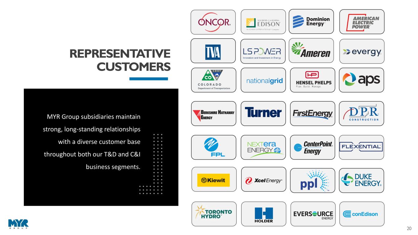 19 CREATING SHAREHOLDER VALUE ORGANIC GROWTH Expand in new and existing markets that align with core capabilities STRATEGIC ACQUISITIONS Evaluate opportunities to expand and hone business expertise PRUDENT CAPITAL RETURNS Authorized new $75M share repurchase program Effective November 2, 2022; will expire May 8, 2023, or when the authorized funds are exhausted, whichever is earlier As of March 31, 2023, the Company had $75.0 million of remaining availability to repurchase shares of the Company’s common stock under the Repurchase Program Identify and evaluate strategic opportunities that achieve long-term growth objectives and leverage our core capabilities Focus on acquisitions that meet clear, long-term return thresholds and are compatible with MYR Group’s values and culture Focus on integration of processes, people, technology, and equipment Strategic expansion of geographic footprint into new markets Invest in additional fleet and labor resources to expand capacity Leverage extensive bid knowledge and long- term customer relationships