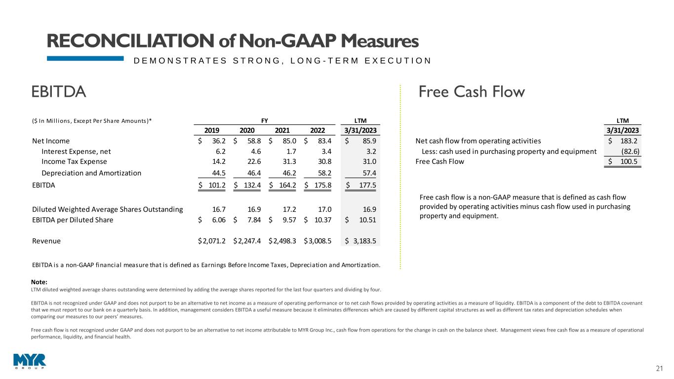 21 D E M O N S T R A T E S S T R O N G , L O N G - T E R M E X E C U T I O N Note: LTM diluted weighted average shares outstanding were determined by adding the average shares reported for the last four quarters and dividing by four. EBITDA is not recognized under GAAP and does not purport to be an alternative to net income as a measure of operating performance or to net cash flows provided by operating activities as a measure of liquidity. EBITDA is a component of the debt to EBITDA covenant that we must report to our bank on a quarterly basis. In addition, management considers EBITDA a useful measure because it eliminates differences which are caused by different capital structures as well as different tax rates and depreciation schedules when comparing our measures to our peers’ measures. Free cash flow is not recognized under GAAP and does not purport to be an alternative to net income attributable to MYR Group Inc., cash flow from operations for the change in cash on the balance sheet. Management views free cash flow as a measure of operational performance, liquidity, and financial health. RECONCILIATION of Non-GAAP Measures ($ In Mi l l ions , Except Per Share Amounts)* FY LTM LTM 2019 2020 2021 2022 3/31/2023 3/31/2023 Net Income 36.2$ 58.8$ 85.0$ 83.4$ 85.9$ Net cash flow from operating activities 183.2$ Interest Expense, net 6.2 4.6 1.7 3.4 3.2 Less: cash used in purchasing property and equipment (82.6) Income Tax Expense 14.2 22.6 31.3 30.8 31.0 Free Cash Flow 100.5$ Depreciation and Amortization 44.5 46.4 46.2 58.2 57.4 EBITDA 101.2$ 132.4$ 164.2$ 175.8$ 177.5$ Diluted Weighted Average Shares Outstanding 16.7 16.9 17.2 17.0 16.9 EBITDA per Diluted Share 6.06$ 7.84$ 9.57$ 10.37$ 10.51$ Revenue 2,071.2$ 2,247.4$ 2,498.3$ 3,008.5$ 3,183.5$ EBITDA is a non-GAAP financial measure that is defined as Earnings Before Income Taxes, Depreciation and Amortization. Free cash flow is a non-GAAP measure that is defined as cash flow provided by operating activities minus cash flow used in purchasing property and equipment. EBITDA Free Cash Flow