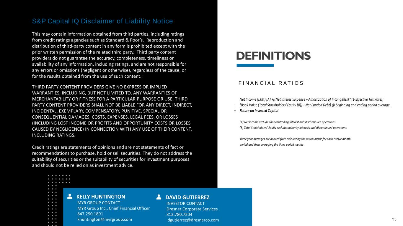 22 F I N A N C I A L R A T I O S NOTE: Images used throughout this presentation may have been taken before COVID. Net Income (LTM) [A] +[(Net Interest Expense + Amortization of Intangibles)* (1-Effective Tax Rate)] ÷ [Book Value (Total Stockholders' Equity [B]) + Net Funded Debt] @ beginning and ending period average = Return on Invested Capital [A] Net Income excludes noncontrolling interest and discontinued operations [B] Total Stockholders' Equity excludes minority interests and discontinued operations Three year averages are derived from calculating the return metric for each twelve month period and then averaging the three period metrics S&P Capital IQ Disclaimer of Liability Notice This may contain information obtained from third parties, including ratings from credit ratings agencies such as Standard & Poor’s. Reproduction and distribution of third-party content in any form is prohibited except with the prior written permission of the related third party. Third party content providers do not guarantee the accuracy, completeness, timeliness or availability of any information, including ratings, and are not responsible for any errors or omissions (negligent or otherwise), regardless of the cause, or for the results obtained from the use of such content.. THIRD PARTY CONTENT PROVIDERS GIVE NO EXPRESS OR IMPLIED WARRANTIES, INCLUDING, BUT NOT LIMITED TO, ANY WARRANTIES OF MERCHANTABILITY OR FITNESS FOR A PARTICULAR PURPOSE OR USE. THIRD PARTY CONTENT PROVIDERS SHALL NOT BE LIABLE FOR ANY DIRECT, INDIRECT, INCIDENTAL, EXEMPLARY, COMPENSATORY, PUNITIVE, SPECIAL OR CONSEQUENTIAL DAMAGES, COSTS, EXPENSES, LEGAL FEES, OR LOSSES (INCLUDING LOST INCOME OR PROFITS AND OPPORTUNITY COSTS OR LOSSES CAUSED BY NEGLIGENCE) IN CONNECTION WITH ANY USE OF THEIR CONTENT, INCLUDING RATINGS. Credit ratings are statements of opinions and are not statements of fact or recommendations to purchase, hold or sell securities. They do not address the suitability of securities or the suitability of securities for investment purposes and should not be relied on as investment advice. DAVID GUTIERREZ INVESTOR CONTACT Dresner Corporate Services 312.780.7204 dgutierrez@dresnerco.com KELLY HUNTINGTON MYR GROUP CONTACT MYR Group Inc., Chief Financial Officer 847.290.1891 khuntington@myrgroup.com DEFINITIONS