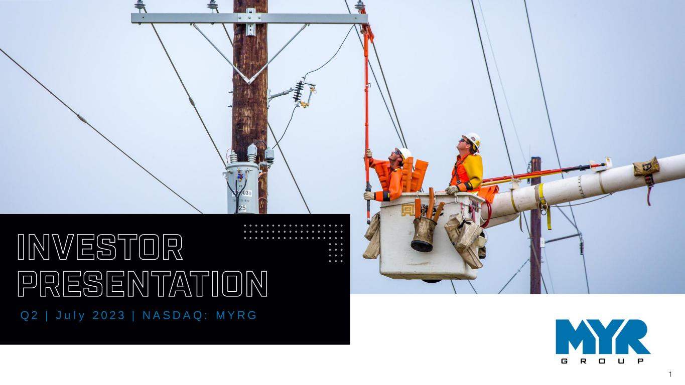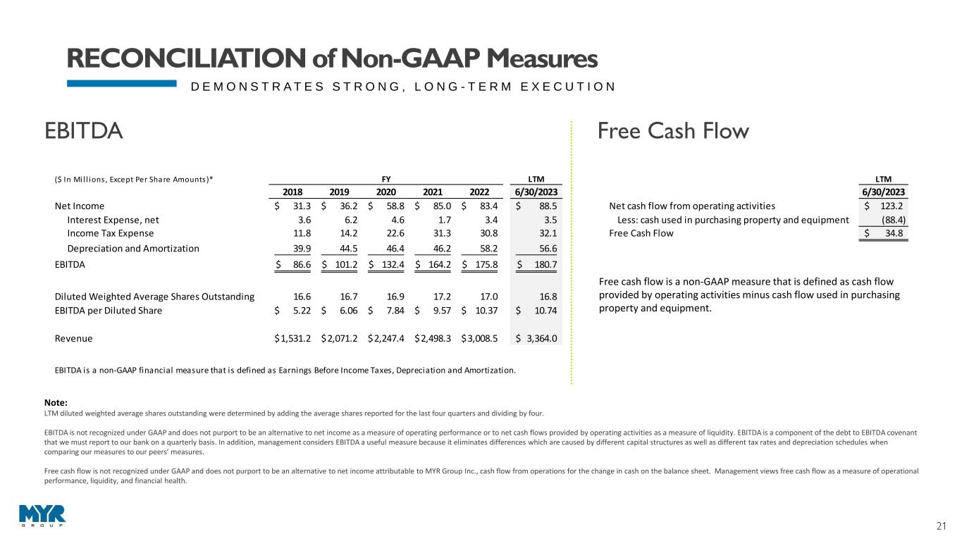 22 F I N A N C I A L R A T I O S NOTE: Images used throughout this presentation may have been taken before COVID. Net Income (LTM) [A] +[(Net Interest Expense + Amortization of Intangibles)* (1-Effective Tax Rate)] ÷ [Book Value (Total Stockholders' Equity [B]) + Net Funded Debt] @ beginning and ending period average = Return on Invested Capital [A] Net Income excludes noncontrolling interest and discontinued operations [B] Total Stockholders' Equity excludes minority interests and discontinued operations Three year averages are derived from calculating the return metric for each twelve month period and then averaging the three period metrics S&P Capital IQ Disclaimer of Liability Notice This may contain information obtained from third parties, including ratings from credit ratings agencies such as Standard & Poor’s. Reproduction and distribution of third-party content in any form is prohibited except with the prior written permission of the related third party. Third party content providers do not guarantee the accuracy, completeness, timeliness or availability of any information, including ratings, and are not responsible for any errors or omissions (negligent or otherwise), regardless of the cause, or for the results obtained from the use of such content.. THIRD PARTY CONTENT PROVIDERS GIVE NO EXPRESS OR IMPLIED WARRANTIES, INCLUDING, BUT NOT LIMITED TO, ANY WARRANTIES OF MERCHANTABILITY OR FITNESS FOR A PARTICULAR PURPOSE OR USE. THIRD PARTY CONTENT PROVIDERS SHALL NOT BE LIABLE FOR ANY DIRECT, INDIRECT, INCIDENTAL, EXEMPLARY, COMPENSATORY, PUNITIVE, SPECIAL OR CONSEQUENTIAL DAMAGES, COSTS, EXPENSES, LEGAL FEES, OR LOSSES (INCLUDING LOST INCOME OR PROFITS AND OPPORTUNITY COSTS OR LOSSES CAUSED BY NEGLIGENCE) IN CONNECTION WITH ANY USE OF THEIR CONTENT, INCLUDING RATINGS. Credit ratings are statements of opinions and are not statements of fact or recommendations to purchase, hold or sell securities. They do not address the suitability of securities or the suitability of securities for investment purposes and should not be relied on as investment advice. DAVID GUTIERREZ INVESTOR CONTACT Dresner Corporate Services 312.780.7204 dgutierrez@dresnerco.com KELLY HUNTINGTON MYR GROUP CONTACT MYR Group Inc., Chief Financial Officer 847.290.1891 khuntington@myrgroup.com DEFINITIONS