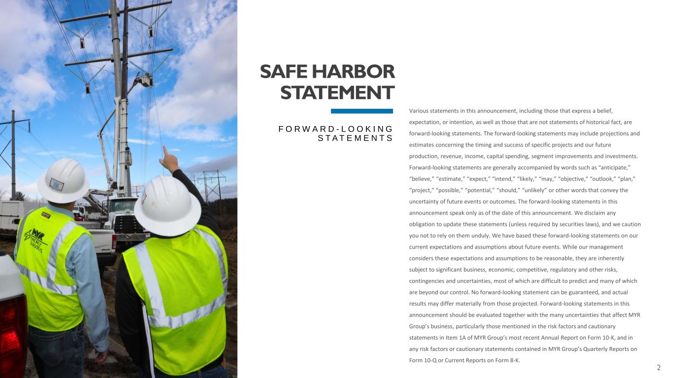 2 SAFE HARBOR STATEMENT F O R W A R D - L O O K I N G S T A T E M E N T S Various statements in this announcement, including those that express a belief, expectation, or intention, as well as those that are not statements of historical fact, are forward-looking statements. The forward-looking statements may include projections and estimates concerning the timing and success of specific projects and our future production, revenue, income, capital spending, segment improvements and investments. Forward-looking statements are generally accompanied by words such as “anticipate,” “believe,” “estimate,” “expect,” “intend,” “likely,” “may,” “objective,” “outlook,” “plan,” “project,” “possible,” “potential,” “should,” “unlikely” or other words that convey the uncertainty of future events or outcomes. The forward-looking statements in this announcement speak only as of the date of this announcement. We disclaim any obligation to update these statements (unless required by securities laws), and we caution you not to rely on them unduly. We have based these forward-looking statements on our current expectations and assumptions about future events. While our management considers these expectations and assumptions to be reasonable, they are inherently subject to significant business, economic, competitive, regulatory and other risks, contingencies and uncertainties, most of which are difficult to predict and many of which are beyond our control. No forward-looking statement can be guaranteed, and actual results may differ materially from those projected. Forward-looking statements in this announcement should be evaluated together with the many uncertainties that affect MYR Group’s business, particularly those mentioned in the risk factors and cautionary statements in Item 1A of MYR Group’s most recent Annual Report on Form 10-K, and in any risk factors or cautionary statements contained in MYR Group’s Quarterly Reports on Form 10-Q or Current Reports on Form 8-K.