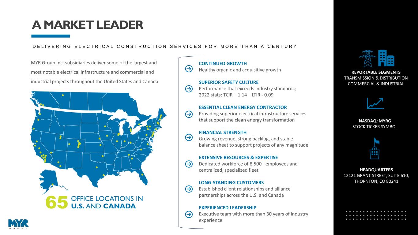 3 D E L I V E R I N G E L E C T R I C A L C O N S T R U C T I O N S E R V I C E S F O R M O R E T H A N A C E N T U R Y 65 OFFICE LOCATIONS IN U.S. AND CANADA MYR Group Inc. subsidiaries deliver some of the largest and most notable electrical infrastructure and commercial and industrial projects throughout the United States and Canada. REPORTABLE SEGMENTS TRANSMISSION & DISTRIBUTION COMMERCIAL & INDUSTRIAL HEADQUARTERS 12121 GRANT STREET, SUITE 610, THORNTON, CO 80241 NASDAQ: MYRG STOCK TICKER SYMBOL A MARKET LEADER CONTINUED GROWTH Healthy organic and acquisitive growth SUPERIOR SAFETY CULTURE Performance that exceeds industry standards; 2022 stats: TCIR – 1.14 LTIR - 0.09 ESSENTIAL CLEAN ENERGY CONTRACTOR Providing superior electrical infrastructure services that support the clean energy transformation FINANCIAL STRENGTH Growing revenue, strong backlog, and stable balance sheet to support projects of any magnitude EXTENSIVE RESOURCES & EXPERTISE Dedicated workforce of 8,500+ employees and centralized, specialized fleet LONG-STANDING CUSTOMERS Established client relationships and alliance partnerships across the U.S. and Canada EXPERIENCED LEADERSHIP Executive team with more than 30 years of industry experience