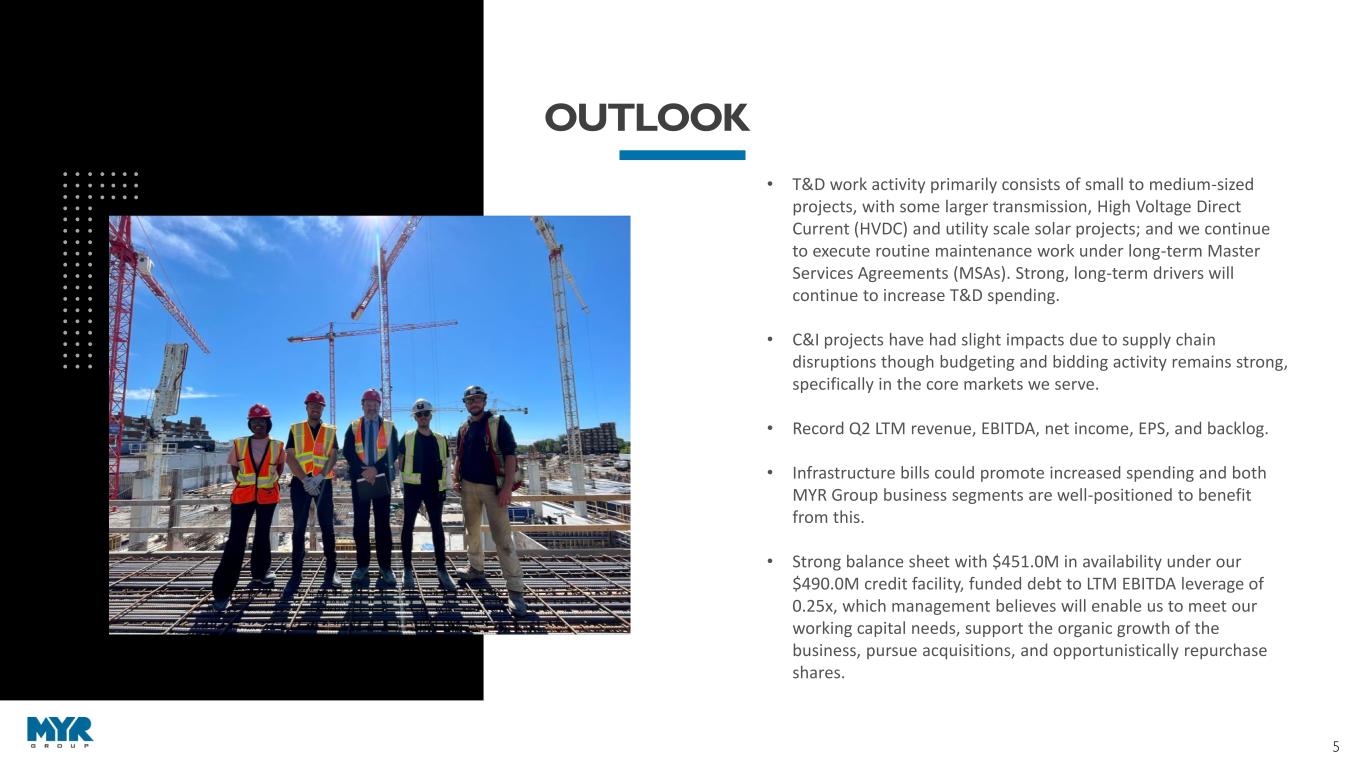 4 Achieved record revenue in 2022, up 20% from 2021 $3.36B LTM Q2 2023 $1.53B 2018 $2.07B 2019 $2.25B 2020 $3.01B 2022 RANKED AMONG TOP 5 U.S. SPECIALTY ELECTRICAL CONTRACTORS 28 YEARS IN A ROW $2.50B 2021 CAGR 19.1%