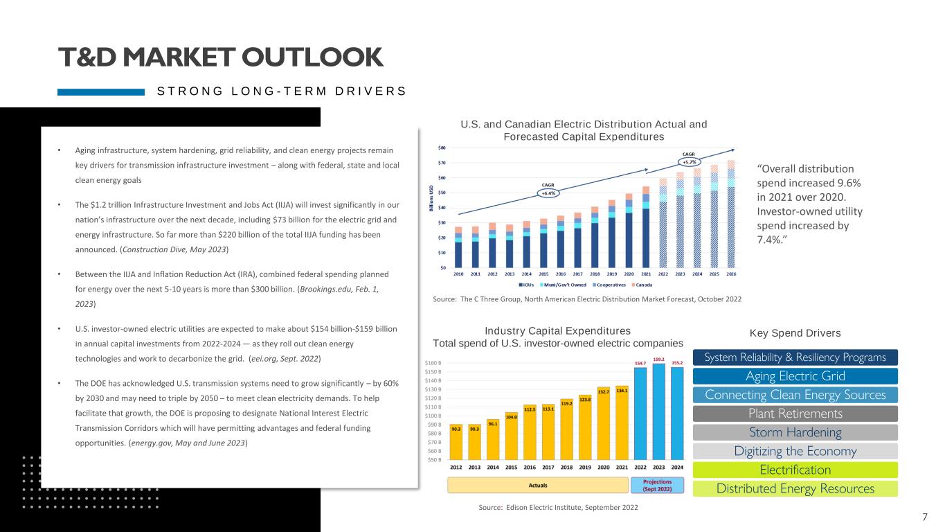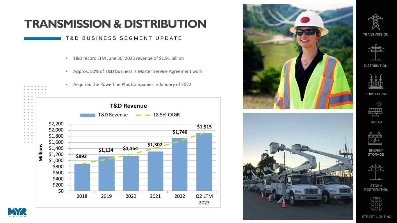 6 T & D B U S I N E S S S E G M E N T U P D A T E • T&D record LTM June 30, 2023 revenue of $1.91 billion • Approx. 50% of T&D business is Master Service Agreement work • Acquired the Powerline Plus Companies in January of 2022 $893 $1,134 $1,154 $1,302 $1,746 $1,915 $0 $200 $400 $600 $800 $1,000 $1,200 $1,400 $1,600 $1,800 $2,000 $2,200 2018 2019 2020 2021 2022 Q2 LTM 2023 M il li o n s T&D Revenue T&D Revenue 18.5% CAGR TRANSMISSION & DISTRIBUTION TRANSMISSION DISTRIBUTION SUBSTATION SOLAR ENERGY STORAGE STORM RESTORATION STREET LIGHTING