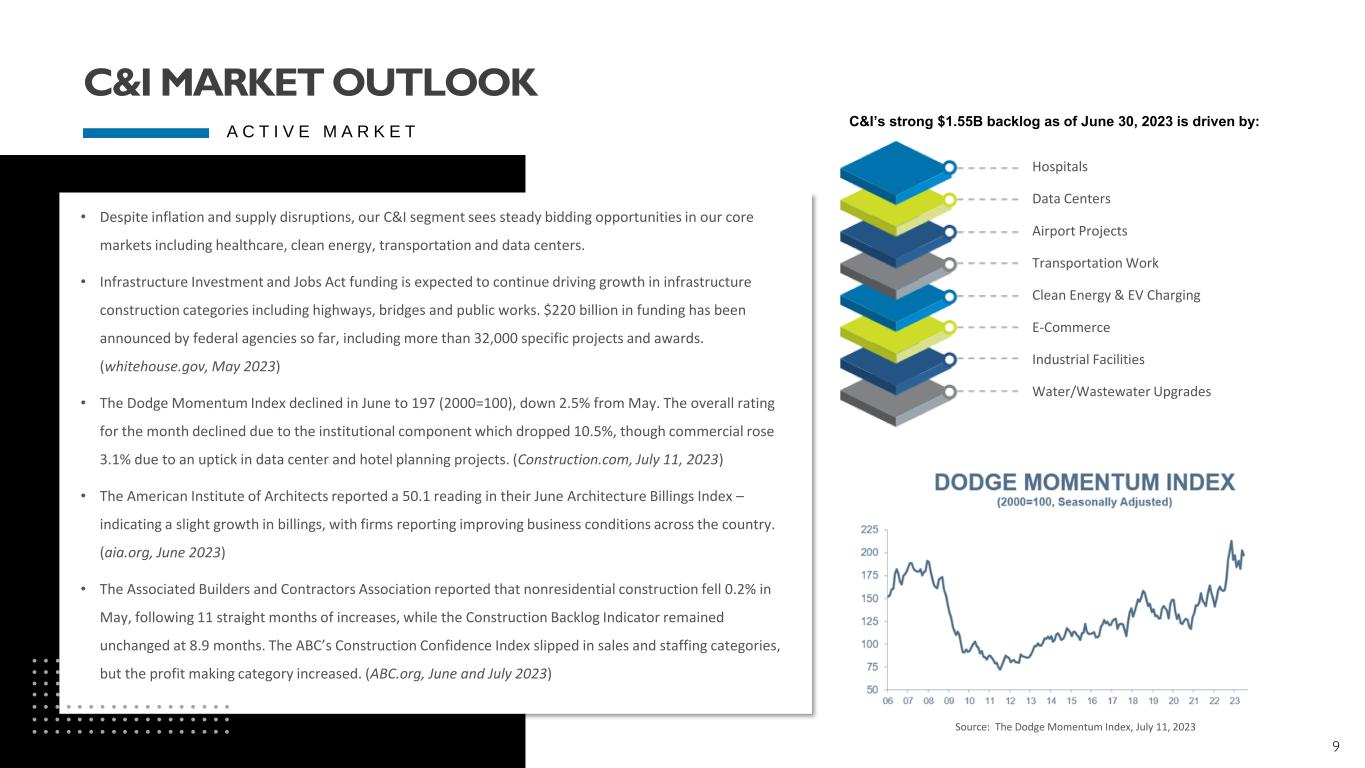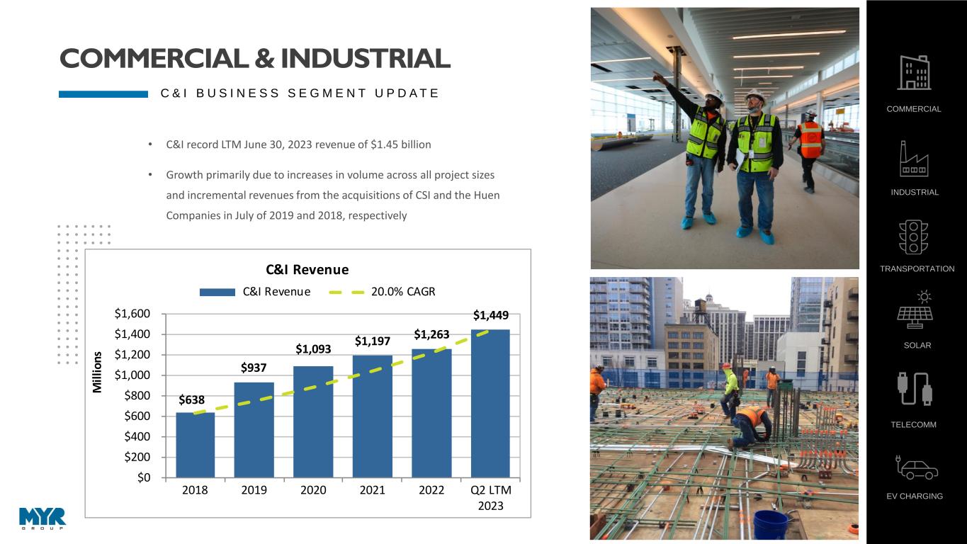8 • C&I record LTM June 30, 2023 revenue of $1.45 billion • Growth primarily due to increases in volume across all project sizes and incremental revenues from the acquisitions of CSI and the Huen Companies in July of 2019 and 2018, respectively $638 $937 $1,093 $1,197 $1,263 $1,449 $0 $200 $400 $600 $800 $1,000 $1,200 $1,400 $1,600 2018 2019 2020 2021 2022 Q2 LTM 2023 M il li o n s C&I Revenue C&I Revenue 20.0% CAGR COMMERCIAL INDUSTRIAL TRANSPORTATION SOLAR TELECOMM EV CHARGING C & I B U S I N E S S S E G M E N T U P D A T E COMMERCIAL & INDUSTRIAL