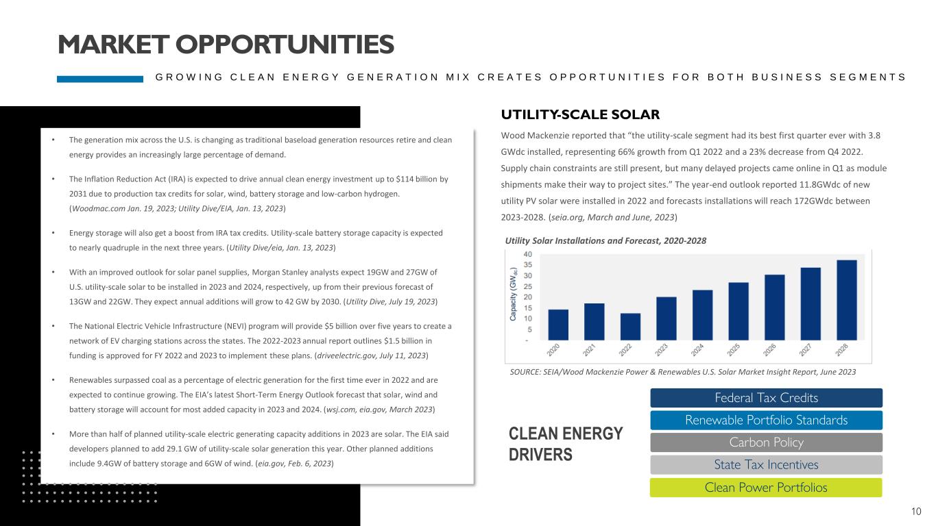 10 UTILITY-SCALE SOLAR Federal Tax Credits Renewable Portfolio Standards Carbon Policy State Tax Incentives Clean Power Portfolios CLEAN ENERGY DRIVERS SOURCE: SEIA/Wood Mackenzie Power & Renewables U.S. Solar Market Insight Report, June 2023 • The generation mix across the U.S. is changing as traditional baseload generation resources retire and clean energy provides an increasingly large percentage of demand. • The Inflation Reduction Act (IRA) is expected to drive annual clean energy investment up to $114 billion by 2031 due to production tax credits for solar, wind, battery storage and low-carbon hydrogen. (Woodmac.com Jan. 19, 2023; Utility Dive/EIA, Jan. 13, 2023) • Energy storage will also get a boost from IRA tax credits. Utility-scale battery storage capacity is expected to nearly quadruple in the next three years. (Utility Dive/eia, Jan. 13, 2023) • With an improved outlook for solar panel supplies, Morgan Stanley analysts expect 19GW and 27GW of U.S. utility-scale solar to be installed in 2023 and 2024, respectively, up from their previous forecast of 13GW and 22GW. They expect annual additions will grow to 42 GW by 2030. (Utility Dive, July 19, 2023) • The National Electric Vehicle Infrastructure (NEVI) program will provide $5 billion over five years to create a network of EV charging stations across the states. The 2022-2023 annual report outlines $1.5 billion in funding is approved for FY 2022 and 2023 to implement these plans. (driveelectric.gov, July 11, 2023) • Renewables surpassed coal as a percentage of electric generation for the first time ever in 2022 and are expected to continue growing. The EIA’s latest Short-Term Energy Outlook forecast that solar, wind and battery storage will account for most added capacity in 2023 and 2024. (wsj.com, eia.gov, March 2023) • More than half of planned utility-scale electric generating capacity additions in 2023 are solar. The EIA said developers planned to add 29.1 GW of utility-scale solar generation this year. Other planned additions include 9.4GW of battery storage and 6GW of wind. (eia.gov, Feb. 6, 2023) Wood Mackenzie reported that “the utility-scale segment had its best first quarter ever with 3.8 GWdc installed, representing 66% growth from Q1 2022 and a 23% decrease from Q4 2022. Supply chain constraints are still present, but many delayed projects came online in Q1 as module shipments make their way to project sites.” The year-end outlook reported 11.8GWdc of new utility PV solar were installed in 2022 and forecasts installations will reach 172GWdc between 2023-2028. (seia.org, March and June, 2023) G R O W I N G C L E A N E N E R G Y G E N E R A T I O N M I X C R E A T E S O P P O R T U N I T I E S F O R B O T H B U S I N E S S S E G M E N T S MARKET OPPORTUNITIES Utility Solar Installations and Forecast, 2020-2028