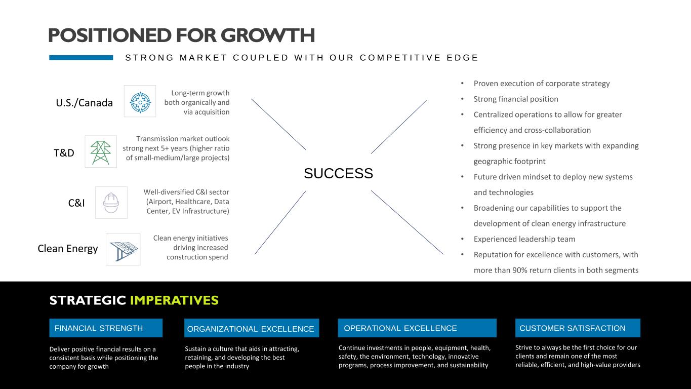 12 U.S./Canada Long-term growth both organically and via acquisition T&D Transmission market outlook strong next 5+ years (higher ratio of small-medium/large projects) C&I Well-diversified C&I sector (Airport, Healthcare, Data Center, EV Infrastructure) Clean Energy Clean energy initiatives driving increased construction spend SUCCESS STRATEGIC IMPERATIVES FINANCIAL STRENGTH Deliver positive financial results on a consistent basis while positioning the company for growth ORGANIZATIONAL EXCELLENCE Sustain a culture that aids in attracting, retaining, and developing the best people in the industry OPERATIONAL EXCELLENCE Continue investments in people, equipment, health, safety, the environment, technology, innovative programs, process improvement, and sustainability CUSTOMER SATISFACTION Strive to always be the first choice for our clients and remain one of the most reliable, efficient, and high-value providers • Proven execution of corporate strategy • Strong financial position • Centralized operations to allow for greater efficiency and cross-collaboration • Strong presence in key markets with expanding geographic footprint • Future driven mindset to deploy new systems and technologies • Broadening our capabilities to support the development of clean energy infrastructure • Experienced leadership team • Reputation for excellence with customers, with more than 90% return clients in both segments S T R O N G M A R K E T C O U P L E D W I T H O U R C O M P E T I T I V E E D G E POSITIONED FOR GROWTH