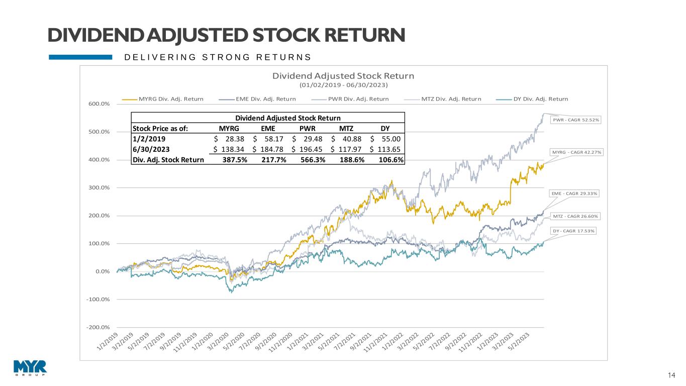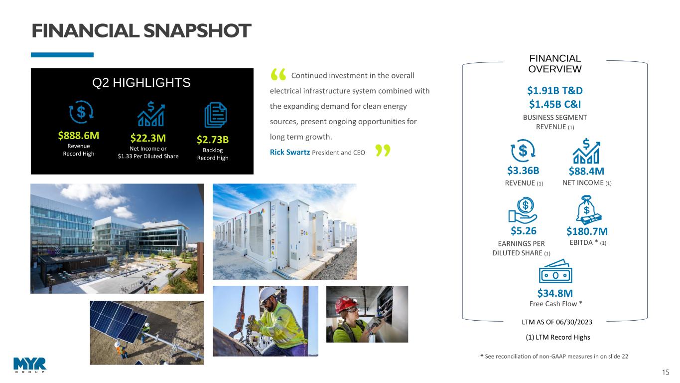 14 D E L I V E R I N G S T R O N G R E T U R N S MYRG - CAGR 42.27% EME - CAGR 29.33% PWR - CAGR 52.52% MTZ - CAGR 26.60% DY - CAGR 17.53% -200.0% -100.0% 0.0% 100.0% 200.0% 300.0% 400.0% 500.0% 600.0% Dividend Adjusted Stock Return (01/02/2019 - 06/30/2023) MYRG Div. Adj. Return EME Div. Adj. Return PWR Div. Adj. Return MTZ Div. Adj. Return DY Div. Adj. Return Dividend Adjusted Stock Return Stock Price as of: MYRG EME PWR MTZ DY 1/2/2019 28.38$ 58.17$ 29.48$ 40.88$ 55.00$ 6/30/2023 138.34$ 184.78$ 196.45$ 117.97$ 113.65$ Div. Adj. Stock Return 387.5% 217.7% 566.3% 188.6% 106.6% DIVIDEND ADJUSTED STOCK RETURN