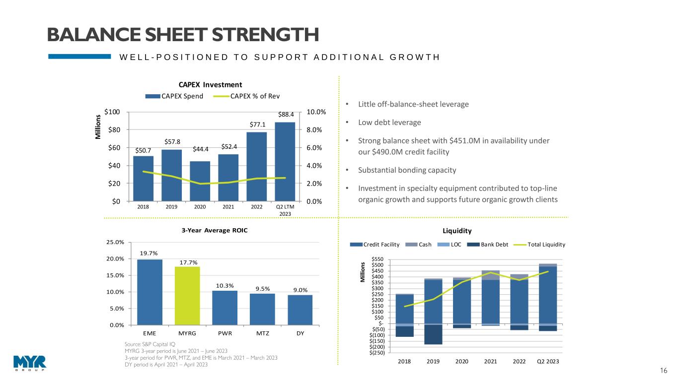 15 * See reconciliation of non-GAAP measures in on slide 22 FINANCIAL SNAPSHOT Q2 HIGHLIGHTS $22.3M Net Income or $1.33 Per Diluted Share $2.73B Backlog Record High $888.6M Revenue Record High BUSINESS SEGMENT REVENUE (1) $1.91B T&D $1.45B C&I REVENUE (1) $3.36B EBITDA * (1) $180.7M EARNINGS PER DILUTED SHARE (1) $5.26 NET INCOME (1) $88.4M FINANCIAL OVERVIEW LTM AS OF 06/30/2023 (1) LTM Record Highs Continued investment in the overall electrical infrastructure system combined with the expanding demand for clean energy sources, present ongoing opportunities for long term growth. Rick Swartz President and CEO “ ” $34.8M Free Cash Flow *