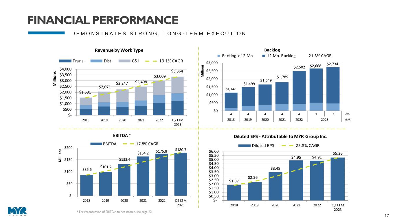 16 W E L L - P O S I T I O N E D T O S U P P O R T A D D I T I O N A L G R O W T H $50.7 $57.8 $44.4 $52.4 $77.1 $88.4 0.0% 2.0% 4.0% 6.0% 8.0% 10.0% $0 $20 $40 $60 $80 $100 2018 2019 2020 2021 2022 Q2 LTM 2023 M ill io n s CAPEX Investment CAPEX Spend CAPEX % of Rev 19.7% 17.7% 10.3% 9.5% 9.0% 0.0% 5.0% 10.0% 15.0% 20.0% 25.0% EME MYRG PWR MTZ DY 3-Year Average ROIC $(250) $(200) $(150) $(100) $(50) $- $50 $100 $150 $200 $250 $300 $350 $400 $450 $500 $550 2018 2019 2020 2021 2022 Q2 2023 M ill io n s Liquidity Credit Facility Cash LOC Bank Debt Total Liquidity Source: S&P Capital IQ MYRG 3-year period is June 2021 – June 2023 3-year period for PWR, MTZ, and EME is March 2021 – March 2023 DY period is April 2021 – April 2023 • Little off-balance-sheet leverage • Low debt leverage • Strong balance sheet with $451.0M in availability under our $490.0M credit facility • Substantial bonding capacity • Investment in specialty equipment contributed to top-line organic growth and supports future organic growth clients BALANCE SHEET STRENGTH