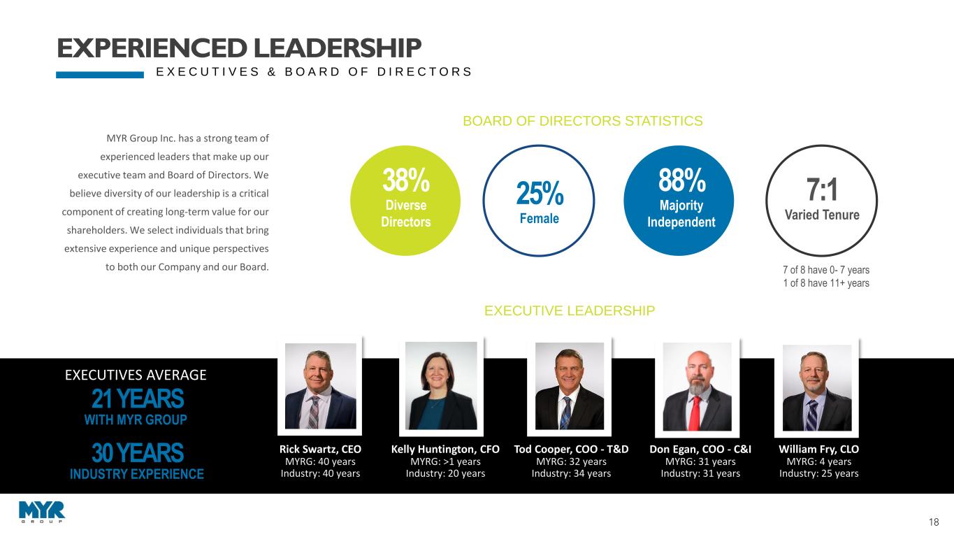 17 D E M O N S T R A T E S S T R O N G , L O N G - T E R M E X E C U T I O N $1,531 $2,071 $2,247 $2,498 $3,009 $3,364 $- $500 $1,000 $1,500 $2,000 $2,500 $3,000 $3,500 $4,000 2018 2019 2020 2021 2022 Q2 LTM 2023 M ill io n s Revenue by Work Type Trans. Dist. C&I 19.1% CAGR $1,147 $1,499 $1,649 $1,789 $2,502 $2,668 $2,734 $0 $500 $1,000 $1,500 $2,000 $2,500 $3,000 4 4 4 4 4 1 2 2018 2019 2020 2021 2022 2023 M ill io ns Backlog Backlog > 12 Mo 12 Mo. Backlog 21.3% CAGR $86.6 $101.2 $132.4 $164.2 $175.8 $180.7 $- $50 $100 $150 $200 2018 2019 2020 2021 2022 Q2 LTM 2023 M il li o n s EBITDA * EBITDA 17.8% CAGR $1.87 $2.26 $3.48 $4.95 $4.91 $5.26 $- $0.50 $1.00 $1.50 $2.00 $2.50 $3.00 $3.50 $4.00 $4.50 $5.00 $5.50 $6.00 2018 2019 2020 2021 2022 Q2 LTM 2023 Diluted EPS - Attributable to MYR Group Inc. Diluted EPS 25.8% CAGR * For reconciliation of EBITDA to net income, see page 22 QTR YEAR FINANCIAL PERFORMANCE
