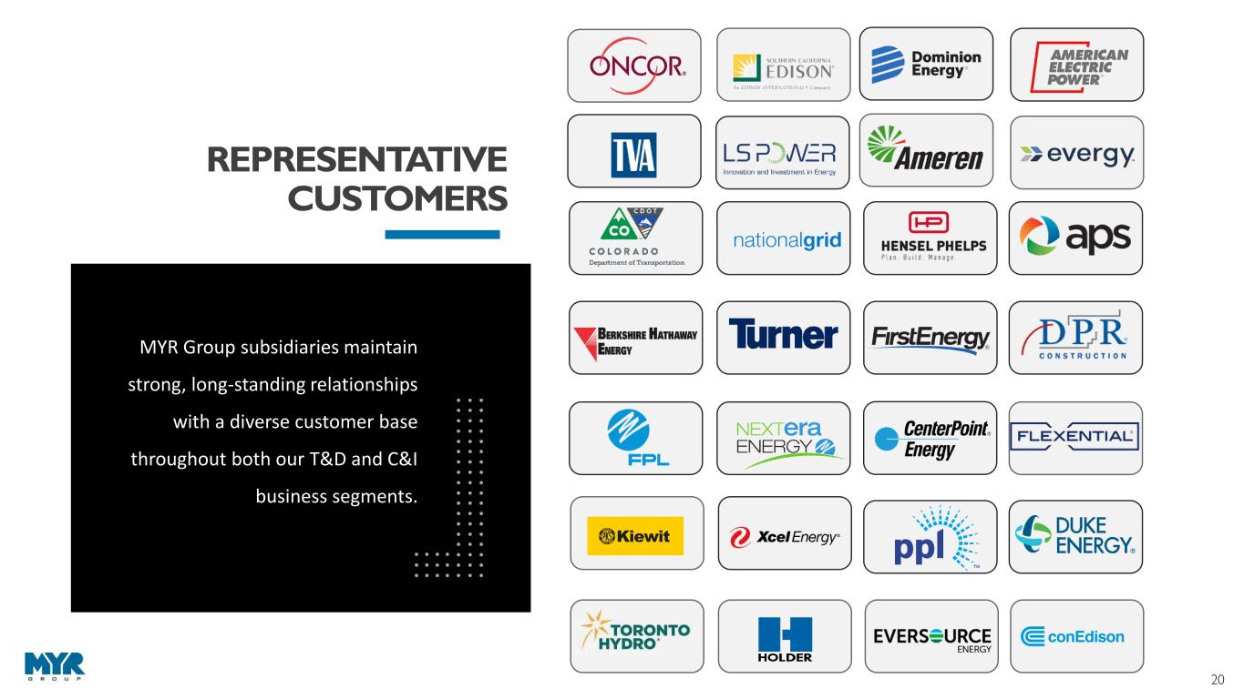 19 CREATING SHAREHOLDER VALUE ORGANIC GROWTH Expand in new and existing markets that align with core capabilities STRATEGIC ACQUISITIONS Evaluate opportunities to expand and hone business expertise PRUDENT CAPITAL RETURNS Opportunistically repurchase shares Authorized $75M share repurchase program on May 9, 2023 Expires November 8, 2023, or when the authorized funds are exhausted, whichever is earlier As of June 30, 2023, $75M of availability remained to repurchase common stock under the current program Identify and evaluate strategic opportunities that achieve long-term growth objectives and leverage our core capabilities Focus on acquisitions that meet clear, long-term return thresholds and are compatible with MYR Group’s values and culture Focus on integration of processes, people, technology, and equipment Strategic expansion of geographic footprint into new markets Invest in additional fleet and labor resources to expand capacity Leverage extensive bid knowledge and long- term customer relationships