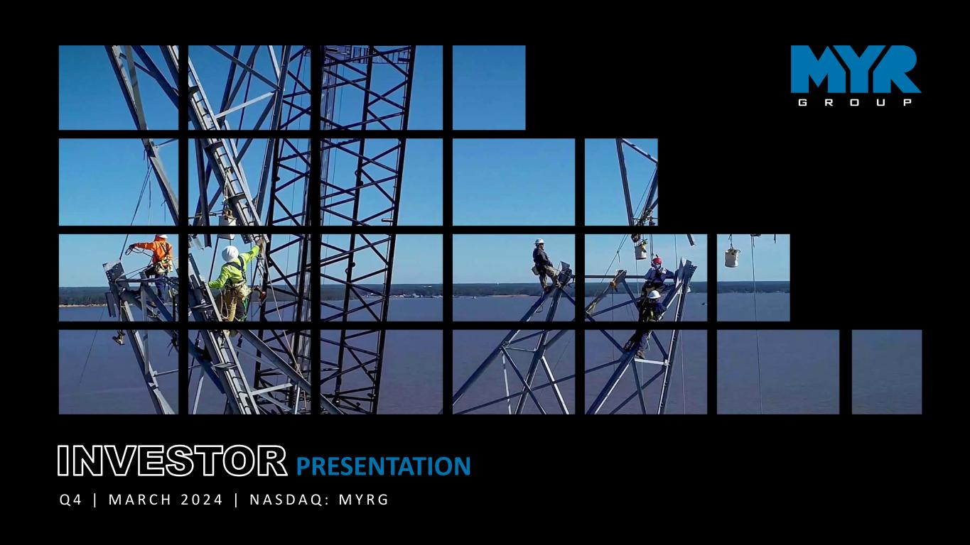 2 Various statements in this announcement, including those that express a belief, expectation, or intention, as well as those that are not statements of historical fact, are forward-looking statements. The forward-looking statements may include projections and estimates concerning the timing and success of specific projects and our future production, revenue, income, capital spending, segment improvements and investments. Forward-looking statements are generally accompanied by words such as “anticipate,” “believe,” “estimate,” “expect,” “intend,” “likely,” “may,” “objective,” “outlook,” “plan,” “project,” “possible,” “potential,” “should,” “unlikely” or other words that convey the uncertainty of future events or outcomes. The forward-looking statements in this announcement speak only as of the date of this announcement. We disclaim any obligation to update these statements (unless required by securities laws), and we caution you not to rely on them unduly. We have based these forward-looking statements on our current expectations and assumptions about future events. While our management considers these expectations and assumptions to be reasonable, they are inherently subject to significant business, economic, competitive, regulatory and other risks, contingencies and uncertainties, most of which are difficult to predict and many of which are beyond our control. No forward-looking statement can be guaranteed, and actual results may differ materially from those projected. Forward-looking statements in this announcement should be evaluated together with the many uncertainties that affect MYR Group’s business, particularly those mentioned in the risk factors and cautionary statements in Item 1A of MYR Group’s most recent Annual Report on Form 10-K, and in any risk factors or cautionary statements contained in MYR Group’s Quarterly Reports on Form 10-Q or Current Reports on Form 8-K. SAFE HARBOR NOTICE FORWARD-LOOKING STATEMENTS