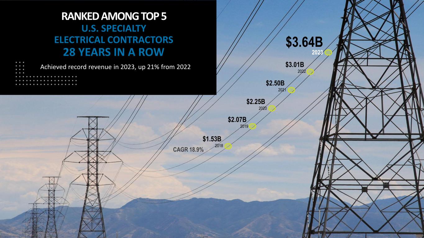 4 Achieved record revenue in 2023, up 21% from 2022 $3.64B 2023 $1.53B 2018 $2.07B 2019 $2.25B 2020 $3.01B 2022 RANKED AMONG TOP 5 U.S. SPECIALTY ELECTRICAL CONTRACTORS 28 YEARS IN A ROW $2.50B 2021 CAGR 18.9%