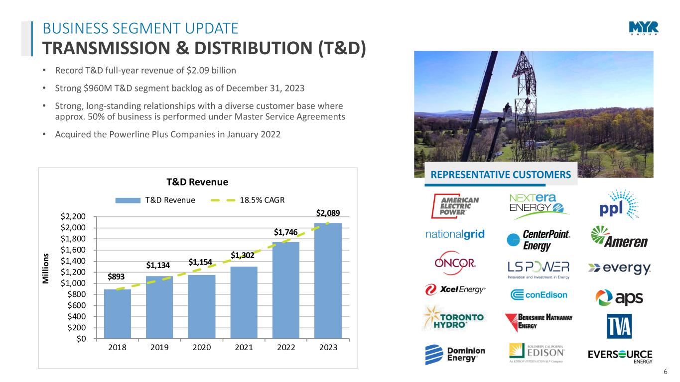 5 • T&D work activity primarily consists of small to medium-sized projects, with some larger transmission, High Voltage Direct Current (HVDC) and utility-scale solar projects. We continue to execute routine maintenance work under long-term Master Services Agreements (MSAs). Strong, long- term drivers will continue to increase T&D spending. • C&I projects have had slight impacts due to supply chain disruptions though budgeting and bidding activity remains strong, specifically in the core markets we serve. • Record full-year revenue, EBITDA, net income, and EPS. • Infrastructure bills could promote increased spending and both MYR Group business segments are well-positioned to benefit from this. • Strong balance sheet with $442M in availability under our $490M credit facility and funded debt to LTM EBITDA leverage of 0.19x, which management believes will enable us to meet our working capital needs, support the organic growth of the business, pursue acquisitions, and opportunistically repurchase shares. WHAT WE SEE OUTLOOK