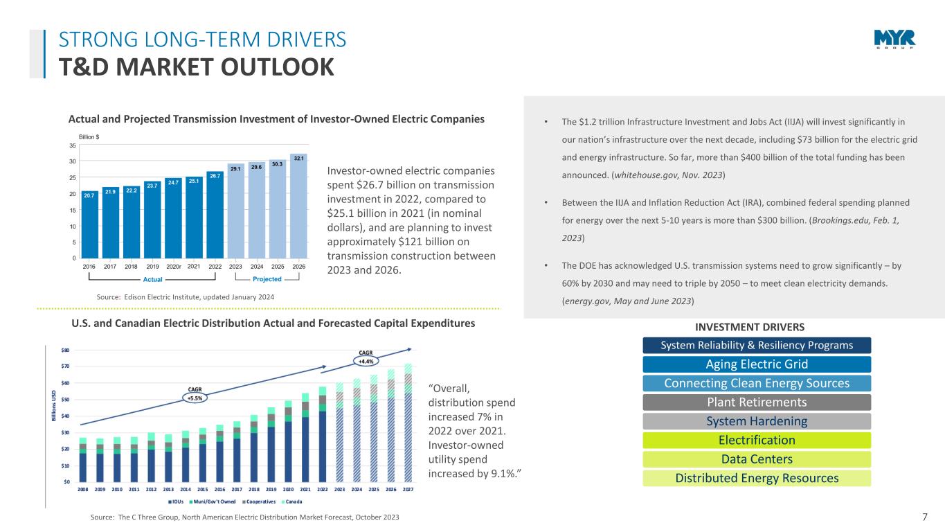6 • Record T&D full-year revenue of $2.09 billion • Strong $960M T&D segment backlog as of December 31, 2023 • Strong, long-standing relationships with a diverse customer base where approx. 50% of business is performed under Master Service Agreements • Acquired the Powerline Plus Companies in January 2022 BUSINESS SEGMENT UPDATE TRANSMISSION & DISTRIBUTION (T&D) REPRESENTATIVE CUSTOMERS $893 $1,134 $1,154 $1,302 $1,746 $2,089 $0 $200 $400 $600 $800 $1,000 $1,200 $1,400 $1,600 $1,800 $2,000 $2,200 2018 2019 2020 2021 2022 2023 M il li o n s T&D Revenue T&D Revenue 18.5% CAGR