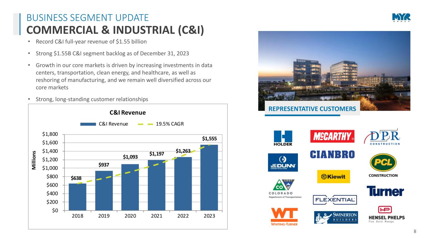 17 $1,531 $2,071 $2,247 $2,498 $3,009 $3,644 $- $500 $1,000 $1,500 $2,000 $2,500 $3,000 $3,500 $4,000 2018 2019 2020 2021 2022 2023 M ill io n s Revenue by Work Type Trans. Dist. C&I 18.9% CAGR $1,147 $1,499 $1,649 $1,789 $2,502 $2,512 $0 $500 $1,000 $1,500 $2,000 $2,500 $3,000 4 4 4 4 4 4 2018 2019 2020 2021 2022 2023 M ill io ns Backlog Backlog > 12 Mo 12 Mo. Backlog 17.0% CAGR $86.6 $101.2 $132.4 $164.2 $175.8 $188.2 $- $20 $40 $60 $80 $100 $120 $140 $160 $180 $200 2018 2019 2020 2021 2022 2023 M ill io n s EBITDA * EBITDA 16.8% CAGR $1.87 $2.26 $3.48 $4.95 $4.91 $5.40 $- $0.50 $1.00 $1.50 $2.00 $2.50 $3.00 $3.50 $4.00 $4.50 $5.00 $5.50 $6.00 2018 2019 2020 2021 2022 2023 Diluted EPS - Attributable to MYR Group Inc. Diluted EPS 23.6% CAGR * For reconciliation of EBITDA to net income, see page 20 QTR YEAR DEMONSTRATES STRONG, LONG-TERM EXECUTION FINANCIAL PERFORMANCE