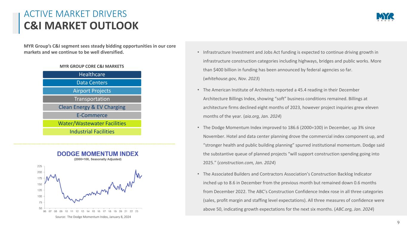 8 • Record C&I full-year revenue of $1.55 billion • Strong $1.55B C&I segment backlog as of December 31, 2023 • Growth in our core markets is driven by increasing investments in data centers, transportation, clean energy, and healthcare, as well as reshoring of manufacturing, and we remain well diversified across our core markets • Strong, long-standing customer relationships REPRESENTATIVE CUSTOMERS BUSINESS SEGMENT UPDATE COMMERCIAL & INDUSTRIAL (C&I) $638 $937 $1,093 $1,197 $1,263 $1,555 $0 $200 $400 $600 $800 $1,000 $1,200 $1,400 $1,600 $1,800 2018 2019 2020 2021 2022 2023 M il li o n s C&I Revenue C&I Revenue 19.5% CAGR