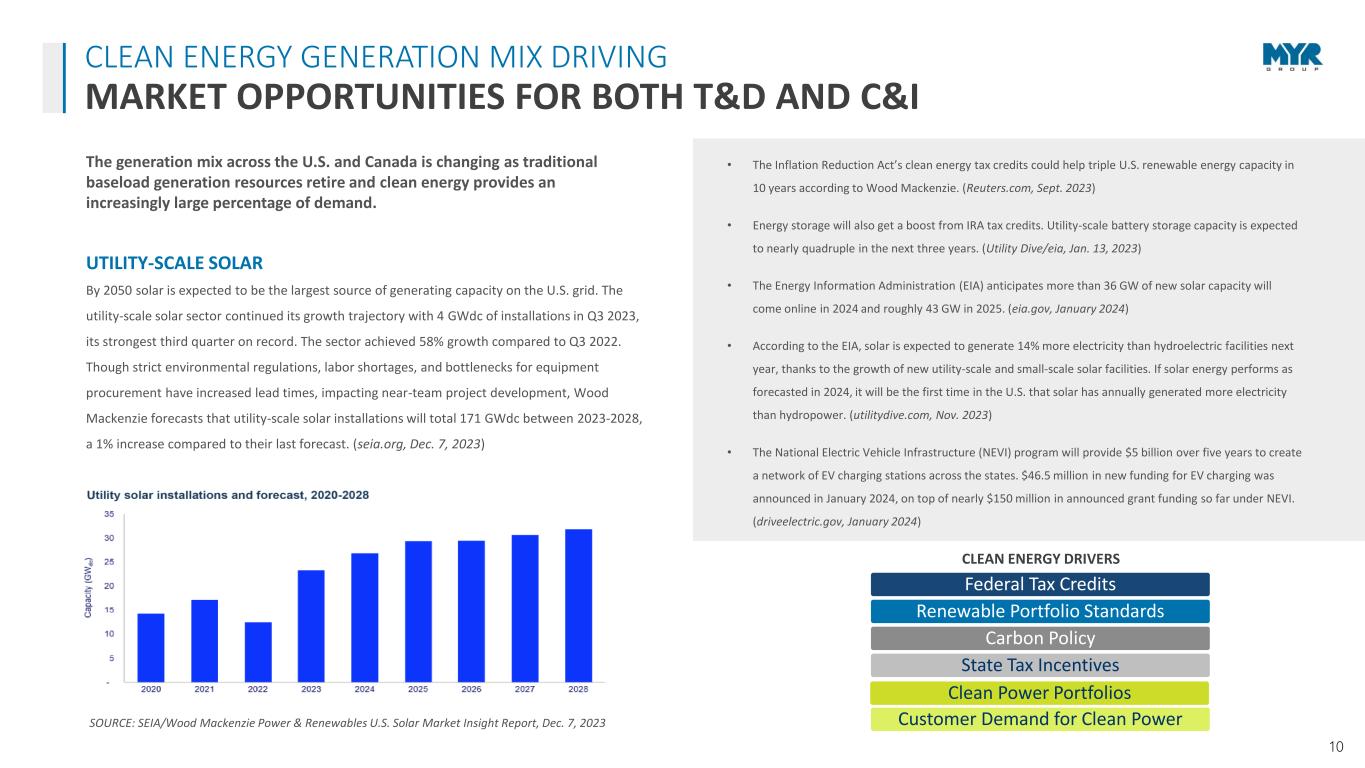 9 Healthcare Data Centers Airport Projects Transportation Clean Energy & EV Charging E-Commerce Water/Wastewater Facilities Industrial Facilities MYR GROUP CORE C&I MARKETS ACTIVE MARKET DRIVERS C&I MARKET OUTLOOK • Infrastructure Investment and Jobs Act funding is expected to continue driving growth in infrastructure construction categories including highways, bridges and public works. More than $400 billion in funding has been announced by federal agencies so far. (whitehouse.gov, Nov. 2023) • The American Institute of Architects reported a 45.4 reading in their December Architecture Billings Index, showing “soft” business conditions remained. Billings at architecture firms declined eight months of 2023, however project inquiries grew eleven months of the year. (aia.org, Jan. 2024) • The Dodge Momentum Index improved to 186.6 (2000=100) in December, up 3% since November. Hotel and data center planning drove the commercial index component up, and “stronger health and public building planning” spurred institutional momentum. Dodge said the substantive queue of planned projects “will support construction spending going into 2025.” (construction.com, Jan. 2024) • The Associated Builders and Contractors Association’s Construction Backlog Indicator inched up to 8.6 in December from the previous month but remained down 0.6 months from December 2022. The ABC’s Construction Confidence Index rose in all three categories (sales, profit margin and staffing level expectations). All three measures of confidence were above 50, indicating growth expectations for the next six months. (ABC.org, Jan. 2024) Source: The Dodge Momentum Index, January 8, 2024 MYR Group’s C&I segment sees steady bidding opportunities in our core markets and we continue to be well diversified.