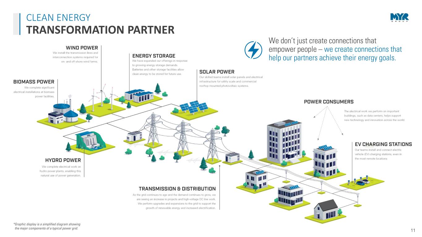 10 CLEAN ENERGY GENERATION MIX DRIVING MARKET OPPORTUNITIES FOR BOTH T&D AND C&I Federal Tax Credits Renewable Portfolio Standards Carbon Policy State Tax Incentives Clean Power Portfolios Customer Demand for Clean Power CLEAN ENERGY DRIVERS UTILITY-SCALE SOLAR SOURCE: SEIA/Wood Mackenzie Power & Renewables U.S. Solar Market Insight Report, Dec. 7, 2023 By 2050 solar is expected to be the largest source of generating capacity on the U.S. grid. The utility-scale solar sector continued its growth trajectory with 4 GWdc of installations in Q3 2023, its strongest third quarter on record. The sector achieved 58% growth compared to Q3 2022. Though strict environmental regulations, labor shortages, and bottlenecks for equipment procurement have increased lead times, impacting near-team project development, Wood Mackenzie forecasts that utility-scale solar installations will total 171 GWdc between 2023-2028, a 1% increase compared to their last forecast. (seia.org, Dec. 7, 2023) The generation mix across the U.S. and Canada is changing as traditional baseload generation resources retire and clean energy provides an increasingly large percentage of demand. • The Inflation Reduction Act’s clean energy tax credits could help triple U.S. renewable energy capacity in 10 years according to Wood Mackenzie. (Reuters.com, Sept. 2023) • Energy storage will also get a boost from IRA tax credits. Utility-scale battery storage capacity is expected to nearly quadruple in the next three years. (Utility Dive/eia, Jan. 13, 2023) • The Energy Information Administration (EIA) anticipates more than 36 GW of new solar capacity will come online in 2024 and roughly 43 GW in 2025. (eia.gov, January 2024) • According to the EIA, solar is expected to generate 14% more electricity than hydroelectric facilities next year, thanks to the growth of new utility-scale and small-scale solar facilities. If solar energy performs as forecasted in 2024, it will be the first time in the U.S. that solar has annually generated more electricity than hydropower. (utilitydive.com, Nov. 2023) • The National Electric Vehicle Infrastructure (NEVI) program will provide $5 billion over five years to create a network of EV charging stations across the states. $46.5 million in new funding for EV charging was announced in January 2024, on top of nearly $150 million in announced grant funding so far under NEVI. (driveelectric.gov, January 2024)