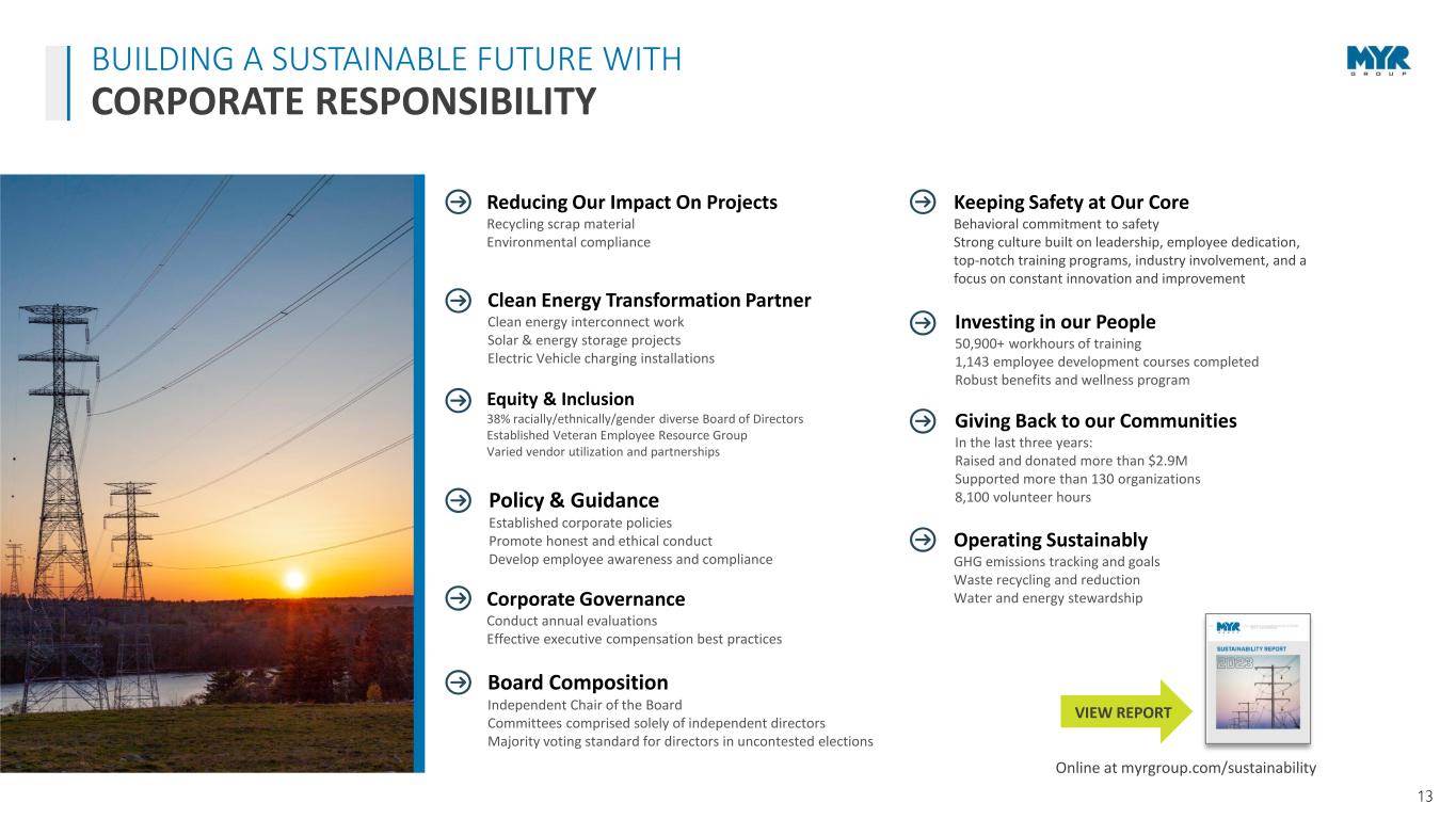 12 STRONG MARKET COUPLED WITH OUR COMPETITIVE EDGE POSITIONS MYR GROUP FOR CONTINUED GROWTH Healthy organic and acquisitive growth Proven execution of corporate strategy Strong financial position Centralized operations for greater efficiency and cross-collaboration Strong presence in key markets with expanding geographic footprint Future-driven mindset to deploy new systems and technologies Broadening our capabilities to support the development of clean energy infrastructure Experienced leadership team Reputation for excellence with customers, with more than 90% return clients in both segments Diversified customer base with no client or contract representing more that 10% of revenue INVESTMENT HIGHLIGHTS U.S./Canada Long-term growth both organically and via acquisition T&D Transmission market outlook strong next 5+ years (higher ratio of small- medium/large projects) C&I Well-diversified C&I sector (Transportation, Healthcare, Data Center, EV Infrastructure) Clean Energy Clean energy initiatives driving increased construction spend MYR GROUP STRATEGIC IMPERATIVES FINANCIAL STRENGTH Deliver positive financial results on a consistent basis while positioning the company for growth ORGANIZATIONAL EXCELLENCE Sustain a culture that aids in attracting, retaining, and developing the best people in the industry OPERATIONAL EXCELLENCE Continue investments in people, equipment, health, safety, the environment, technology, innovative programs, process improvement, and sustainability CUSTOMER SATISFACTION Strive to always be the first choice for our clients and remain one of the most reliable, efficient, and high-value providers STRATEGIC GROWTH