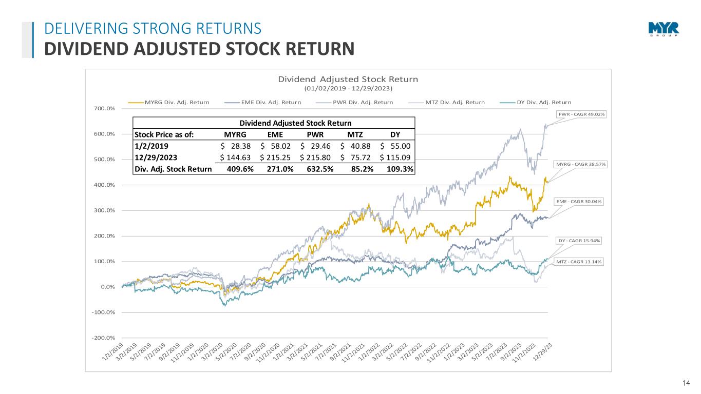 13 BUILDING A SUSTAINABLE FUTURE WITH CORPORATE RESPONSIBILITY VIEW REPORT Policy & Guidance Established corporate policies Promote honest and ethical conduct Develop employee awareness and compliance Equity & Inclusion 38% racially/ethnically/gender diverse Board of Directors Established Veteran Employee Resource Group Varied vendor utilization and partnerships Reducing Our Impact On Projects Recycling scrap material Environmental compliance Clean Energy Transformation Partner Clean energy interconnect work Solar & energy storage projects Electric Vehicle charging installations Giving Back to our Communities In the last three years: Raised and donated more than $2.9M Supported more than 130 organizations 8,100 volunteer hours Operating Sustainably GHG emissions tracking and goals Waste recycling and reduction Water and energy stewardship Investing in our People 50,900+ workhours of training 1,143 employee development courses completed Robust benefits and wellness program Board Composition Independent Chair of the Board Committees comprised solely of independent directors Majority voting standard for directors in uncontested elections Corporate Governance Conduct annual evaluations Effective executive compensation best practices Keeping Safety at Our Core Behavioral commitment to safety Strong culture built on leadership, employee dedication, top-notch training programs, industry involvement, and a focus on constant innovation and improvement Online at myrgroup.com/sustainability