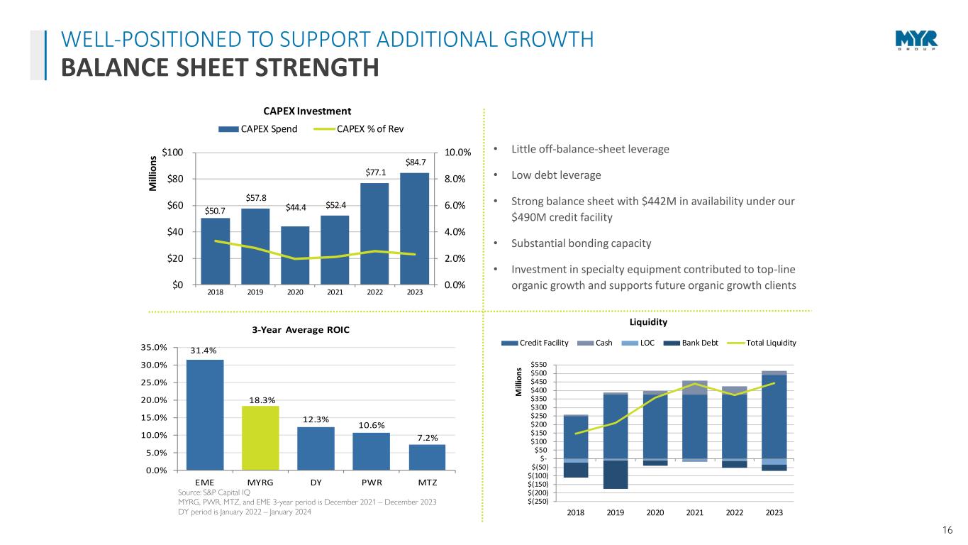 15 Q4 2023 HIGHLIGHTS $24.0M Net Income or $1.43 Per Diluted Share $2.51B Backlog $1.00B Revenue Record High Our financial performance illustrates the overall strength of our core markets, the continued demand and investment in electrical infrastructure, which is bringing steady opportunities for our business, and our ability to maintain and expand our diverse customer relationships. Rick Swartz President and CEO “ ” DELIVERING STRONG RETURNS FINANCIAL SNAPSHOT T&D $2.09B C&I $1.55B BUSINESS SEGMENT REVENUE FULL-YEAR AS OF 12/31/2023 TOTAL REVENUE (1) $3.64B NET INCOME (1) $91.0M EARNINGS PER DILUTED SHARE (1) $5.40 EBITDA * (1) $188.2M FREE CASH FLOW * ($13.7M) (1) Full-year Record Highs * See reconciliation of non-GAAP measures on slide 20 2023 FULL-YEAR FINANCIAL OVERVIEW TOTAL REVENUE $3.64B