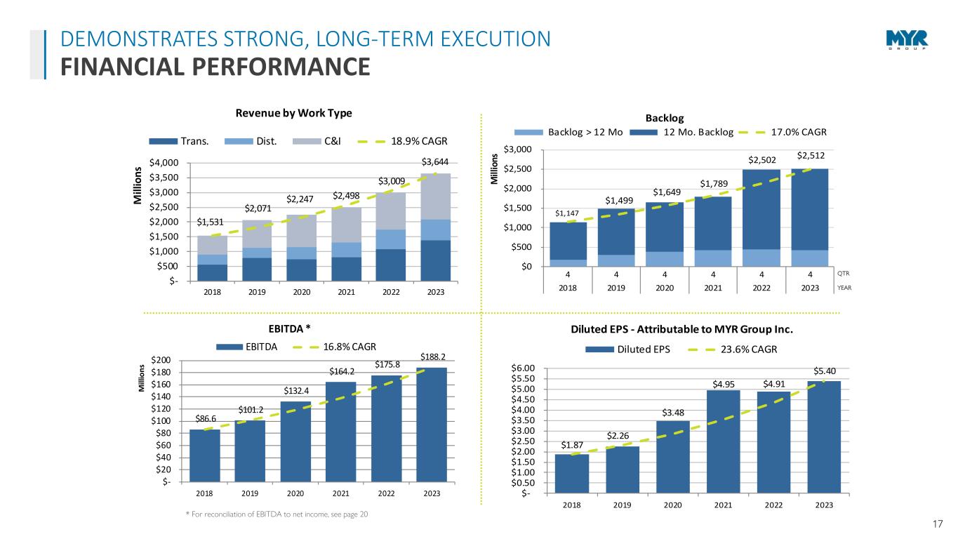 16 $50.7 $57.8 $44.4 $52.4 $77.1 $84.7 0.0% 2.0% 4.0% 6.0% 8.0% 10.0% $0 $20 $40 $60 $80 $100 2018 2019 2020 2021 2022 2023 M ill io n s CAPEX Investment CAPEX Spend CAPEX % of Rev 31.4% 18.3% 12.3% 10.6% 7.2% 0.0% 5.0% 10.0% 15.0% 20.0% 25.0% 30.0% 35.0% EME MYRG DY PWR MTZ 3-Year Average ROIC $(250) $(200) $(150) $(100) $(50) $- $50 $100 $150 $200 $250 $300 $350 $400 $450 $500 $550 2018 2019 2020 2021 2022 2023 M ill io n s Liquidity Credit Facility Cash LOC Bank Debt Total Liquidity Source: S&P Capital IQ MYRG, PWR, MTZ, and EME 3-year period is December 2021 – December 2023 DY period is January 2022 – January 2024 • Little off-balance-sheet leverage • Low debt leverage • Strong balance sheet with $442M in availability under our $490M credit facility • Substantial bonding capacity • Investment in specialty equipment contributed to top-line organic growth and supports future organic growth clients WELL-POSITIONED TO SUPPORT ADDITIONAL GROWTH BALANCE SHEET STRENGTH