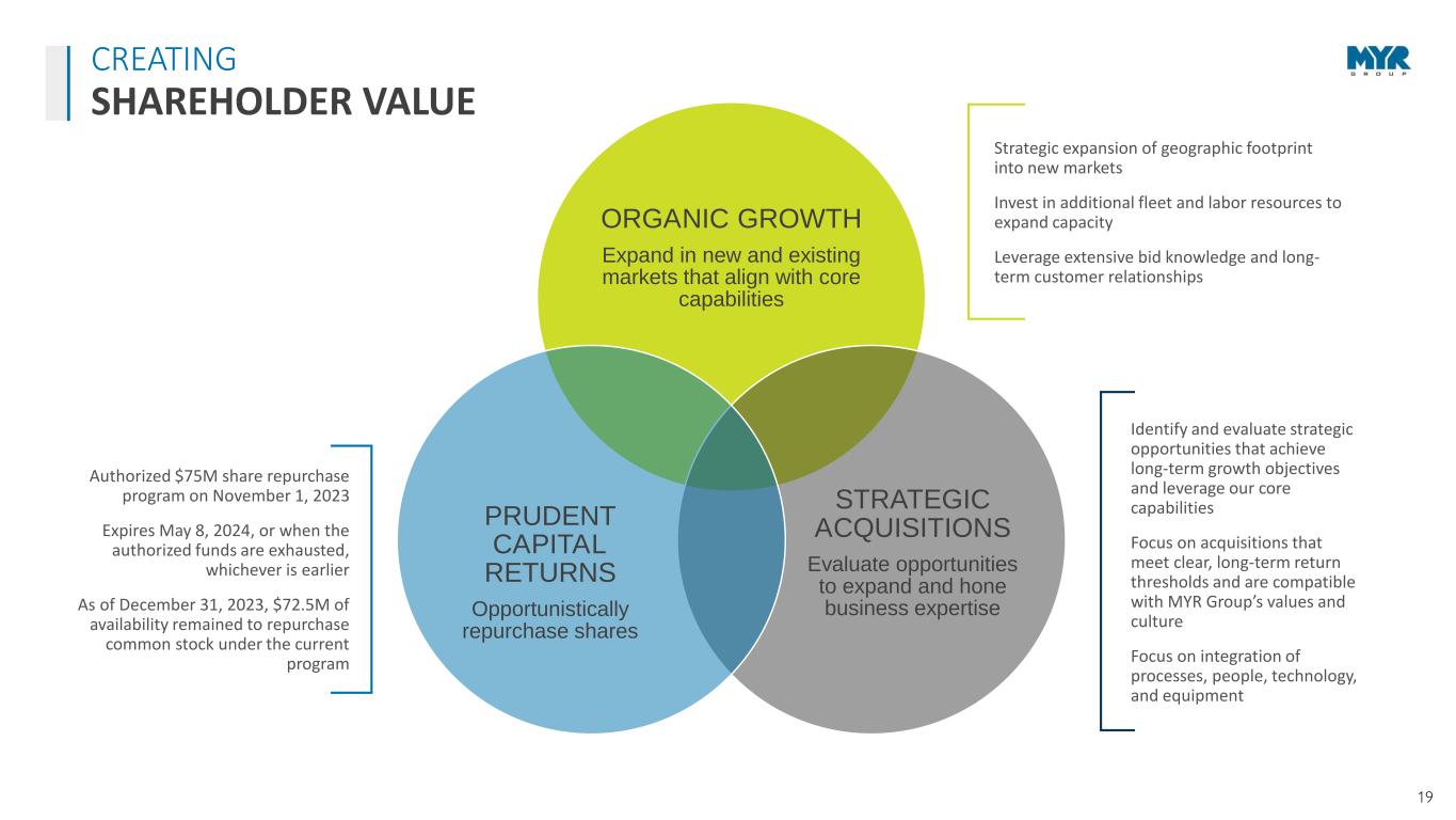18 EXECUTIVE LEADERSHIP Rick Swartz, CEO MYRG: 41 years Industry: 41 years 19 YEARS EXECUTIVES AVERAGE: WITH MYR GROUP Effective February 24, 2023 MYR Group Inc. has a strong team of experienced leaders that make up our executive team and Board of Directors. We believe diversity of our leadership is a critical component of creating long-term value for our shareholders. We select individuals that bring extensive experience and unique perspectives to both our Company and our Board. Kelly Huntington, CFO MYRG: 1 year Industry: 21 years Brian Stern, COO - T&D MYRG: 19 years Industry: 23 years Don Egan, COO - C&I MYRG: 32 years Industry: 32 years William Fry, CLO MYRG: 5 years Industry: 26 years 28 YEARS OF INDUSTRY EXPERIENCE 25% Female 88% Majority Independent 38% Racially/Ethnically/ Gender Diverse Directors BOARD OF DIRECTORS STATISTICS 7:1 Varied Tenure 7 of 8 have 0- 9 years 1 of 8 have 10 years EXECUTIVES & BOARD OF DIRECTORS EXPERIENCED LEADERSHIP TEAM