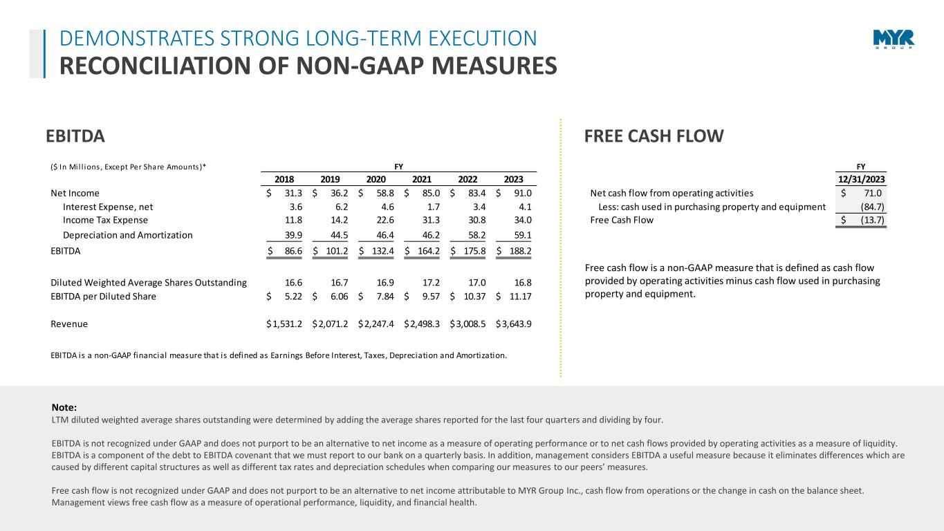 20 Note: LTM diluted weighted average shares outstanding were determined by adding the average shares reported for the last four quarters and dividing by four. EBITDA is not recognized under GAAP and does not purport to be an alternative to net income as a measure of operating performance or to net cash flows provided by operating activities as a measure of liquidity. EBITDA is a component of the debt to EBITDA covenant that we must report to our bank on a quarterly basis. In addition, management considers EBITDA a useful measure because it eliminates differences which are caused by different capital structures as well as different tax rates and depreciation schedules when comparing our measures to our peers’ measures. Free cash flow is not recognized under GAAP and does not purport to be an alternative to net income attributable to MYR Group Inc., cash flow from operations or the change in cash on the balance sheet. Management views free cash flow as a measure of operational performance, liquidity, and financial health. ($ In Mi l l ions , Except Per Share Amounts)* FY FY 2018 2019 2020 2021 2022 2023 12/31/2023 Net Income 31.3$ 36.2$ 58.8$ 85.0$ 83.4$ 91.0$ Net cash flow from operating activities 71.0$ Interest Expense, net 3.6 6.2 4.6 1.7 3.4 4.1 Less: cash used in purchasing property and equipment (84.7) Income Tax Expense 11.8 14.2 22.6 31.3 30.8 34.0 Free Cash Flow (13.7)$ Depreciation and Amortization 39.9 44.5 46.4 46.2 58.2 59.1 EBITDA 86.6$ 101.2$ 132.4$ 164.2$ 175.8$ 188.2$ Diluted Weighted Average Shares Outstanding 16.6 16.7 16.9 17.2 17.0 16.8 EBITDA per Diluted Share 5.22$ 6.06$ 7.84$ 9.57$ 10.37$ 11.17$ Revenue 1,531.2$ 2,071.2$ 2,247.4$ 2,498.3$ 3,008.5$ 3,643.9$ EBITDA is a non-GAAP financial measure that is defined as Earnings Before Interest, Taxes, Depreciation and Amortization. Free cash flow is a non-GAAP measure that is defined as cash flow provided by operating activities minus cash flow used in purchasing property and equipment. EBITDA FREE CASH FLOW DEMONSTRATES STRONG LONG-TERM EXECUTION RECONCILIATION OF NON-GAAP MEASURES