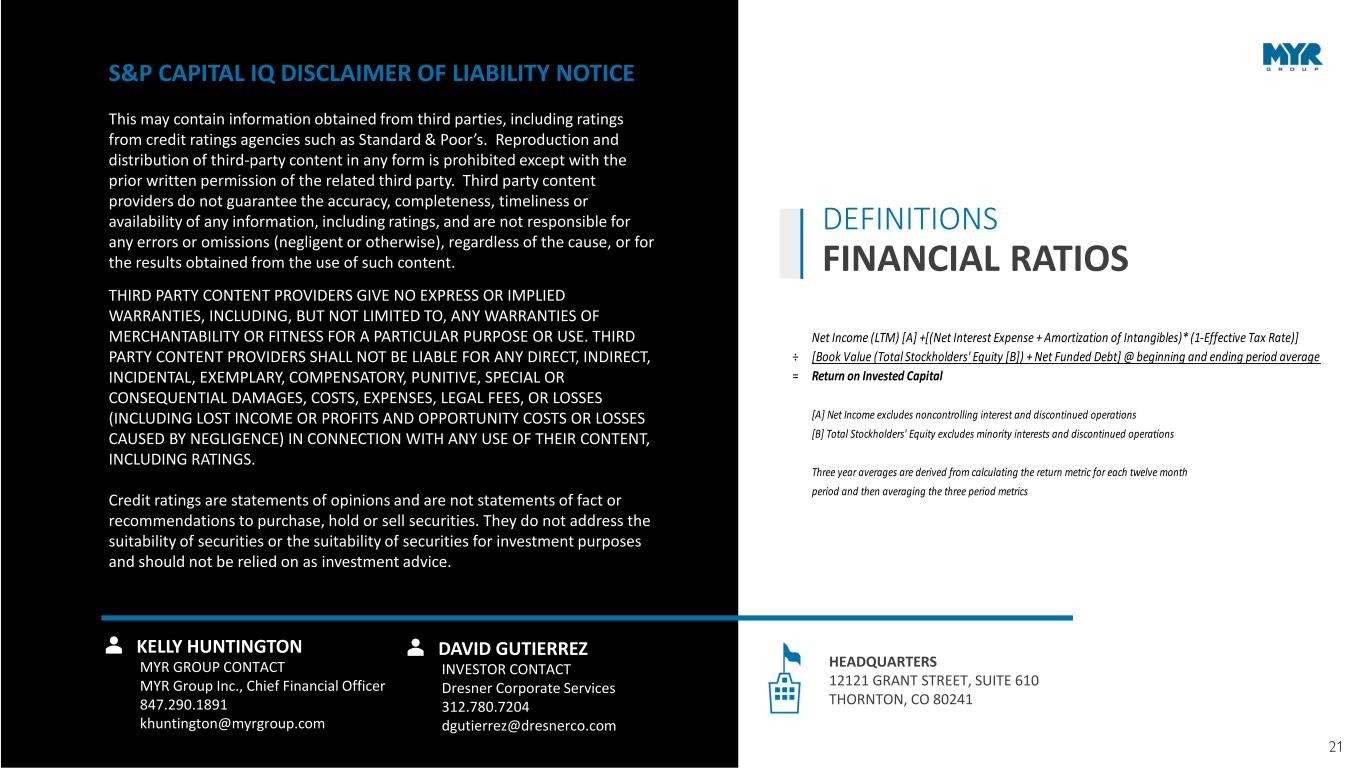 21NOTE: Images used throughout this presentation may have been taken before COVID. Net Income (LTM) [A] +[(Net Interest Expense + Amortization of Intangibles)* (1-Effective Tax Rate)] ÷ [Book Value (Total Stockholders' Equity [B]) + Net Funded Debt] @ beginning and ending period average = Return on Invested Capital [A] Net Income excludes noncontrolling interest and discontinued operations [B] Total Stockholders' Equity excludes minority interests and discontinued operations Three year averages are derived from calculating the return metric for each twelve month period and then averaging the three period metrics S&P CAPITAL IQ DISCLAIMER OF LIABILITY NOTICE This may contain information obtained from third parties, including ratings from credit ratings agencies such as Standard & Poor’s. Reproduction and distribution of third-party content in any form is prohibited except with the prior written permission of the related third party. Third party content providers do not guarantee the accuracy, completeness, timeliness or availability of any information, including ratings, and are not responsible for any errors or omissions (negligent or otherwise), regardless of the cause, or for the results obtained from the use of such content. THIRD PARTY CONTENT PROVIDERS GIVE NO EXPRESS OR IMPLIED WARRANTIES, INCLUDING, BUT NOT LIMITED TO, ANY WARRANTIES OF MERCHANTABILITY OR FITNESS FOR A PARTICULAR PURPOSE OR USE. THIRD PARTY CONTENT PROVIDERS SHALL NOT BE LIABLE FOR ANY DIRECT, INDIRECT, INCIDENTAL, EXEMPLARY, COMPENSATORY, PUNITIVE, SPECIAL OR CONSEQUENTIAL DAMAGES, COSTS, EXPENSES, LEGAL FEES, OR LOSSES (INCLUDING LOST INCOME OR PROFITS AND OPPORTUNITY COSTS OR LOSSES CAUSED BY NEGLIGENCE) IN CONNECTION WITH ANY USE OF THEIR CONTENT, INCLUDING RATINGS. Credit ratings are statements of opinions and are not statements of fact or recommendations to purchase, hold or sell securities. They do not address the suitability of securities or the suitability of securities for investment purposes and should not be relied on as investment advice. DAVID GUTIERREZ INVESTOR CONTACT Dresner Corporate Services 312.780.7204 dgutierrez@dresnerco.com KELLY HUNTINGTON MYR GROUP CONTACT MYR Group Inc., Chief Financial Officer 847.290.1891 khuntington@myrgroup.com HEADQUARTERS 12121 GRANT STREET, SUITE 610 THORNTON, CO 80241 DEFINITIONS FINANCIAL RATIOS