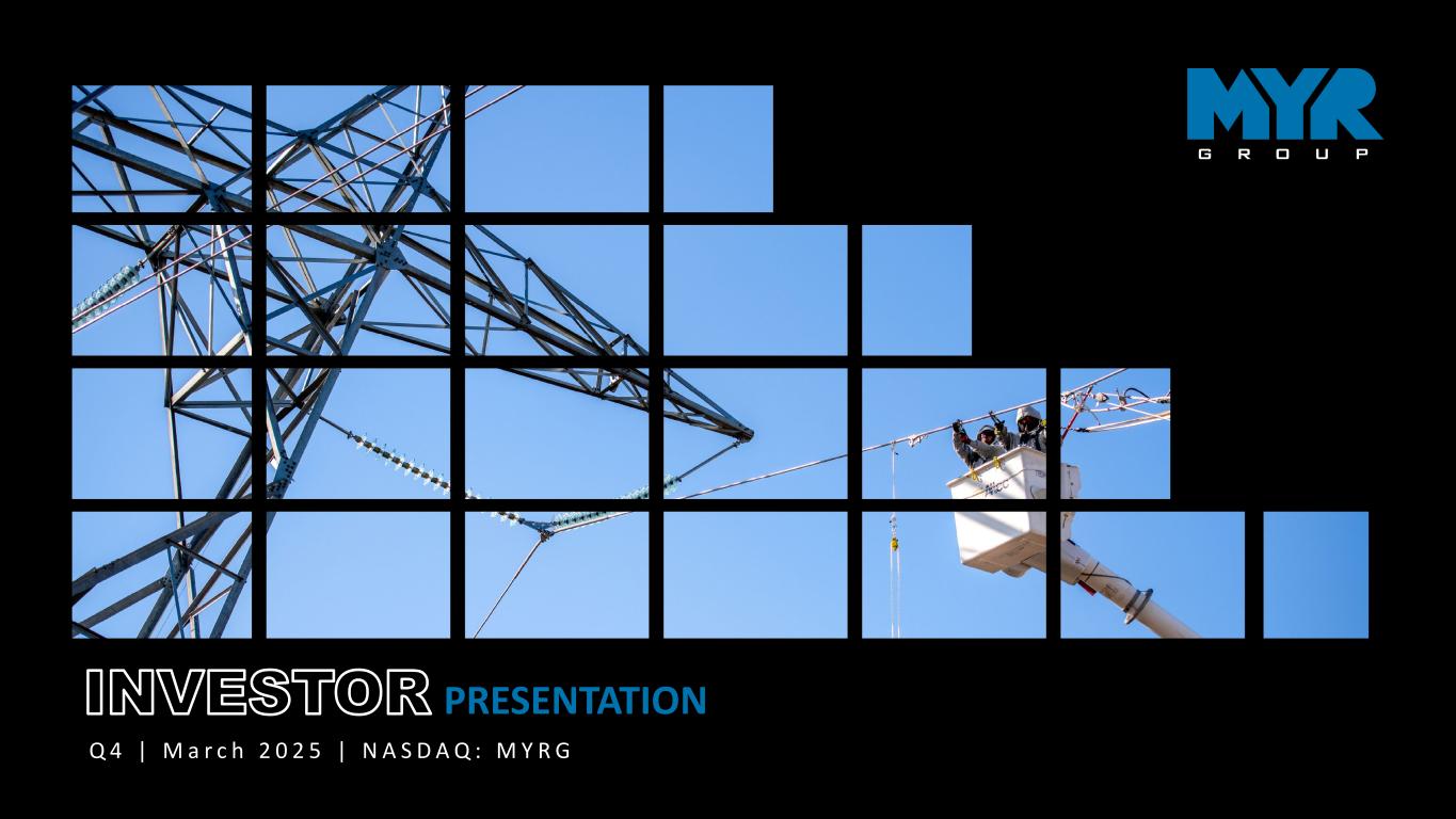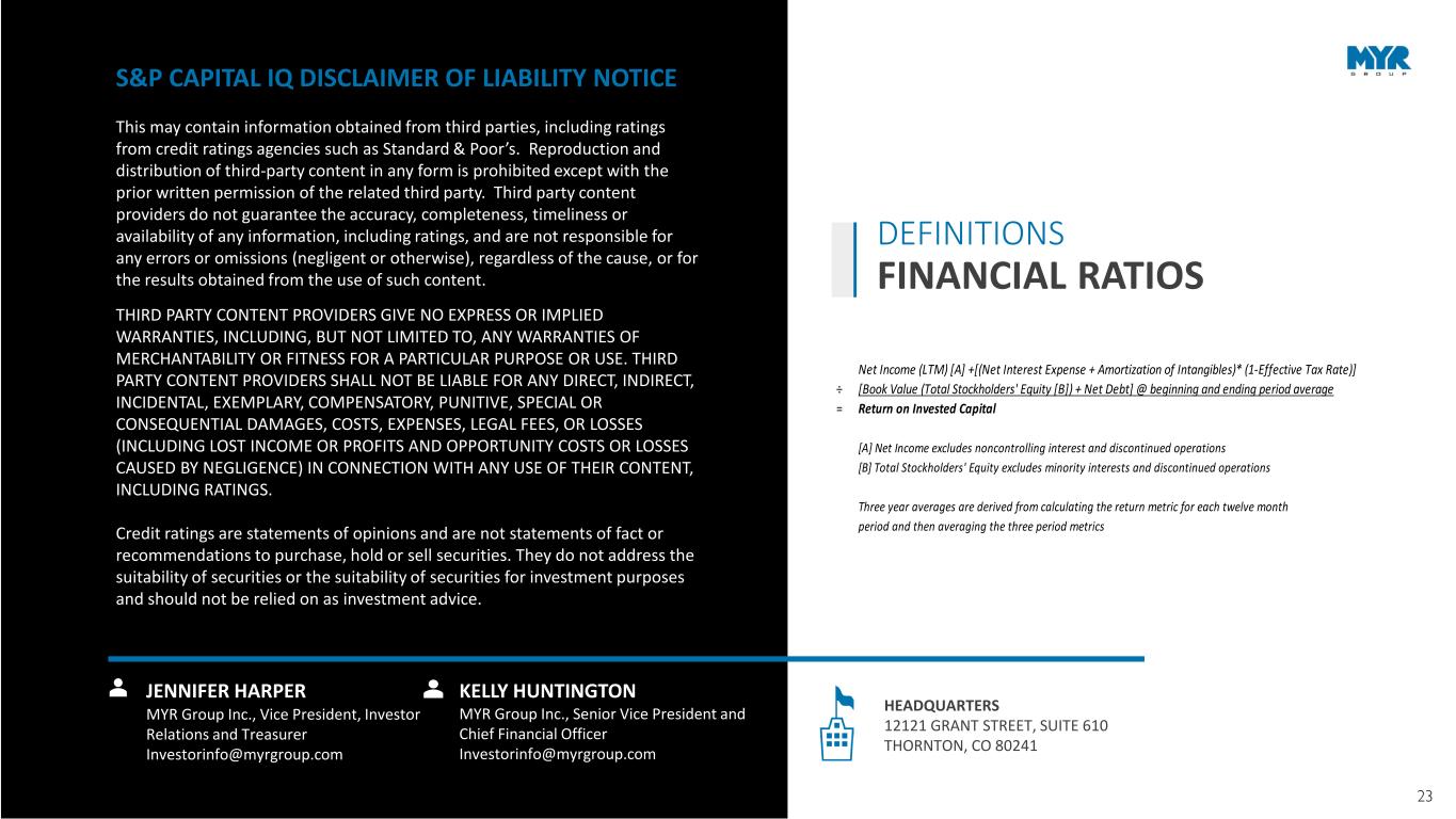 23NOTE: Images used throughout this presentation may have been taken before COVID. Net Income (LTM) [A] +[(Net Interest Expense + Amortization of Intangibles)* (1-Effective Tax Rate)] ÷ [Book Value (Total Stockholders' Equity [B]) + Net Debt] @ beginning and ending period average = Return on Invested Capital [A] Net Income excludes noncontrolling interest and discontinued operations [B] Total Stockholders' Equity excludes minority interests and discontinued operations Three year averages are derived from calculating the return metric for each twelve month period and then averaging the three period metrics S&P CAPITAL IQ DISCLAIMER OF LIABILITY NOTICE This may contain information obtained from third parties, including ratings from credit ratings agencies such as Standard & Poor’s. Reproduction and distribution of third-party content in any form is prohibited except with the prior written permission of the related third party. Third party content providers do not guarantee the accuracy, completeness, timeliness or availability of any information, including ratings, and are not responsible for any errors or omissions (negligent or otherwise), regardless of the cause, or for the results obtained from the use of such content. THIRD PARTY CONTENT PROVIDERS GIVE NO EXPRESS OR IMPLIED WARRANTIES, INCLUDING, BUT NOT LIMITED TO, ANY WARRANTIES OF MERCHANTABILITY OR FITNESS FOR A PARTICULAR PURPOSE OR USE. THIRD PARTY CONTENT PROVIDERS SHALL NOT BE LIABLE FOR ANY DIRECT, INDIRECT, INCIDENTAL, EXEMPLARY, COMPENSATORY, PUNITIVE, SPECIAL OR CONSEQUENTIAL DAMAGES, COSTS, EXPENSES, LEGAL FEES, OR LOSSES (INCLUDING LOST INCOME OR PROFITS AND OPPORTUNITY COSTS OR LOSSES CAUSED BY NEGLIGENCE) IN CONNECTION WITH ANY USE OF THEIR CONTENT, INCLUDING RATINGS. Credit ratings are statements of opinions and are not statements of fact or recommendations to purchase, hold or sell securities. They do not address the suitability of securities or the suitability of securities for investment purposes and should not be relied on as investment advice. JENNIFER HARPER MYR Group Inc., Vice President, Investor Relations and Treasurer Investorinfo@myrgroup.com KELLY HUNTINGTON MYR Group Inc., Senior Vice President and Chief Financial Officer Investorinfo@myrgroup.com HEADQUARTERS 12121 GRANT STREET, SUITE 610 THORNTON, CO 80241 DEFINITIONS FINANCIAL RATIOS