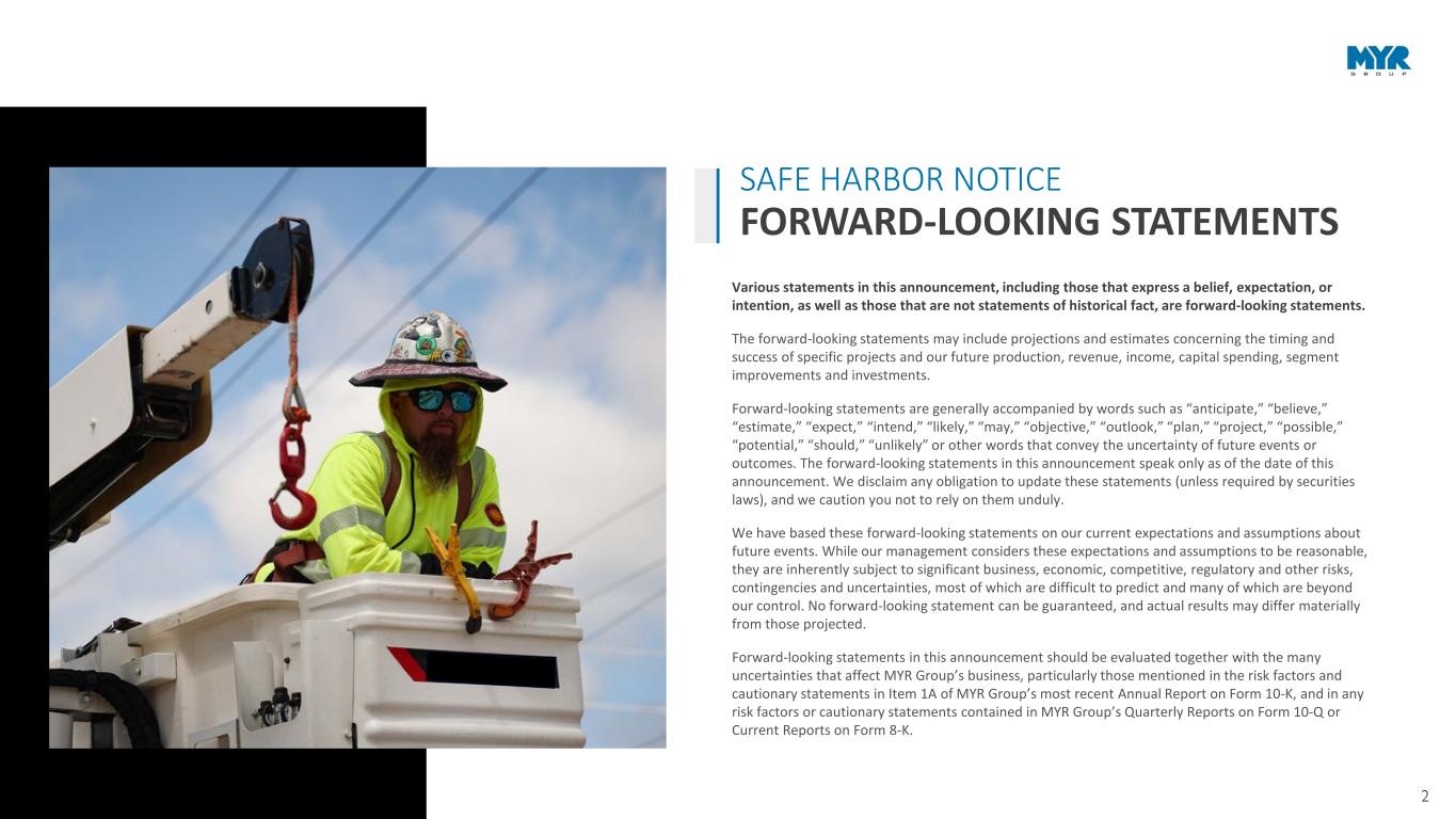 2 Various statements in this announcement, including those that express a belief, expectation, or intention, as well as those that are not statements of historical fact, are forward-looking statements. The forward-looking statements may include projections and estimates concerning the timing and success of specific projects and our future production, revenue, income, capital spending, segment improvements and investments. Forward-looking statements are generally accompanied by words such as “anticipate,” “believe,” “estimate,” “expect,” “intend,” “likely,” “may,” “objective,” “outlook,” “plan,” “project,” “possible,” “potential,” “should,” “unlikely” or other words that convey the uncertainty of future events or outcomes. The forward-looking statements in this announcement speak only as of the date of this announcement. We disclaim any obligation to update these statements (unless required by securities laws), and we caution you not to rely on them unduly. We have based these forward-looking statements on our current expectations and assumptions about future events. While our management considers these expectations and assumptions to be reasonable, they are inherently subject to significant business, economic, competitive, regulatory and other risks, contingencies and uncertainties, most of which are difficult to predict and many of which are beyond our control. No forward-looking statement can be guaranteed, and actual results may differ materially from those projected. Forward-looking statements in this announcement should be evaluated together with the many uncertainties that affect MYR Group’s business, particularly those mentioned in the risk factors and cautionary statements in Item 1A of MYR Group’s most recent Annual Report on Form 10-K, and in any risk factors or cautionary statements contained in MYR Group’s Quarterly Reports on Form 10-Q or Current Reports on Form 8-K. SAFE HARBOR NOTICE FORWARD-LOOKING STATEMENTS