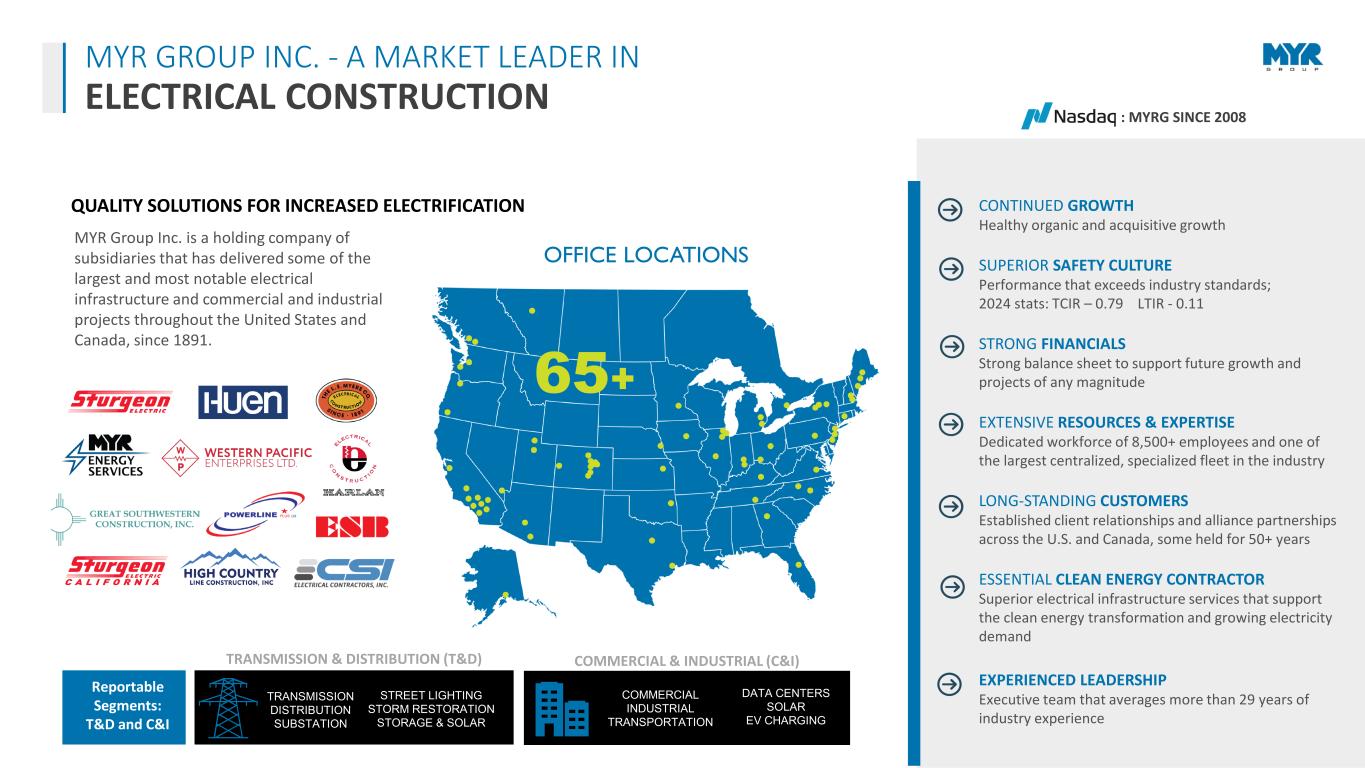 3 QUALITY SOLUTIONS FOR INCREASED ELECTRIFICATION 65+ OFFICE LOCATIONS MYR Group Inc. is a holding company of subsidiaries that has delivered some of the largest and most notable electrical infrastructure and commercial and industrial projects throughout the United States and Canada, since 1891. MYR GROUP INC. - A MARKET LEADER IN ELECTRICAL CONSTRUCTION CONTINUED GROWTH Healthy organic and acquisitive growth SUPERIOR SAFETY CULTURE Performance that exceeds industry standards; 2024 stats: TCIR – 0.79 LTIR - 0.11 STRONG FINANCIALS Strong balance sheet to support future growth and projects of any magnitude EXTENSIVE RESOURCES & EXPERTISE Dedicated workforce of 8,500+ employees and one of the largest centralized, specialized fleet in the industry LONG-STANDING CUSTOMERS Established client relationships and alliance partnerships across the U.S. and Canada, some held for 50+ years ESSENTIAL CLEAN ENERGY CONTRACTOR Superior electrical infrastructure services that support the clean energy transformation and growing electricity demand EXPERIENCED LEADERSHIP Executive team that averages more than 29 years of industry experience : MYRG SINCE 2008 Reportable Segments: T&D and C&I COMMERCIAL INDUSTRIAL TRANSPORTATION DATA CENTERS SOLAR EV CHARGING COMMERCIAL & INDUSTRIAL (C&I) TRANSMISSION DISTRIBUTION SUBSTATION STREET LIGHTING STORM RESTORATION STORAGE & SOLAR TRANSMISSION & DISTRIBUTION (T&D)